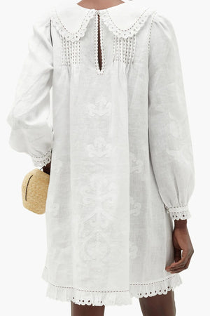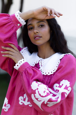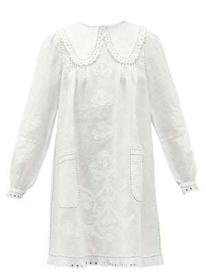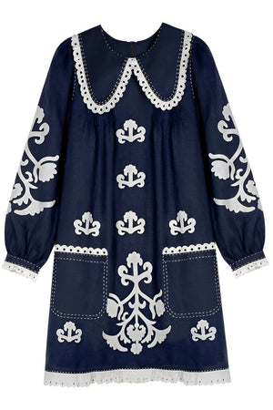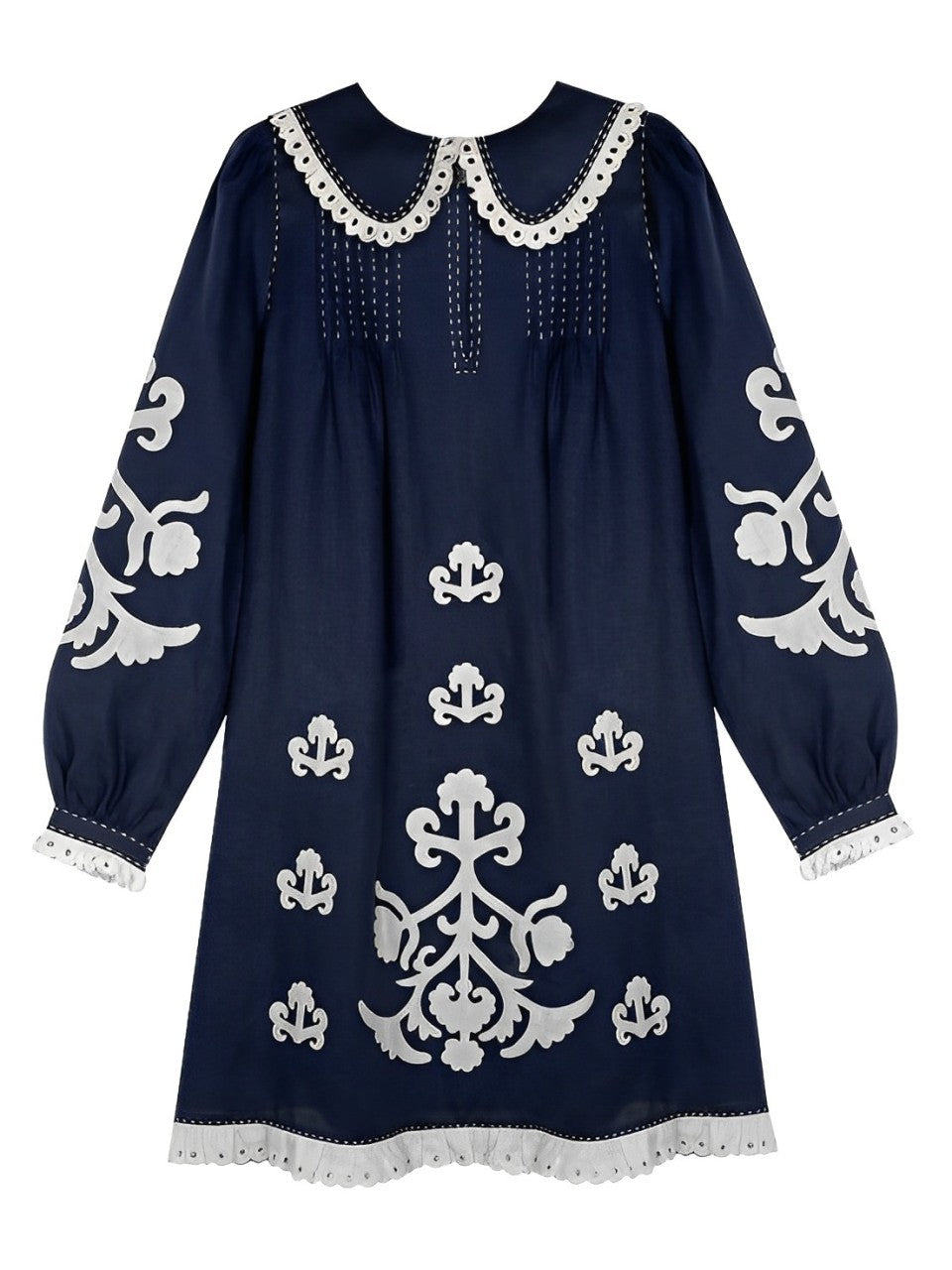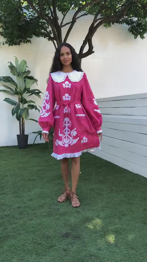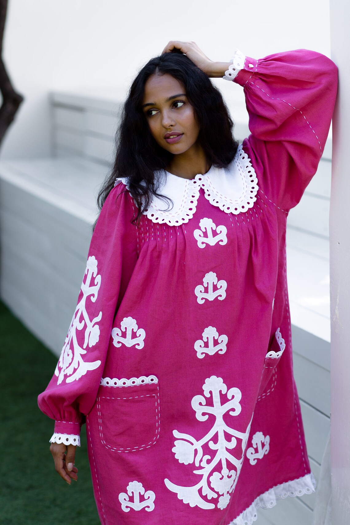 This unique bohemian dress features ethnic applique embroidery on soft linen fabric, available in a variety of complementary colors. Perfect for a vacation-inspired look.