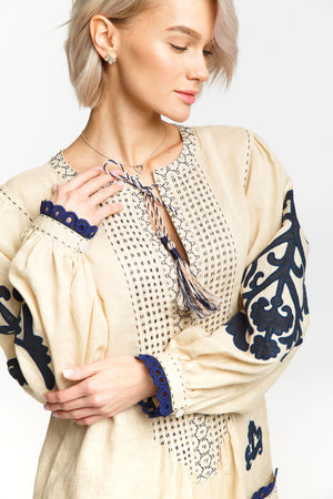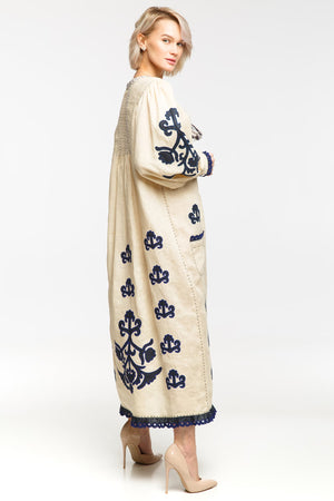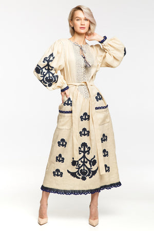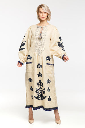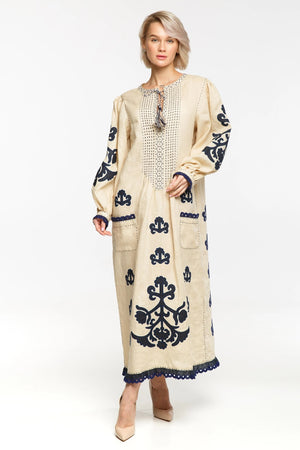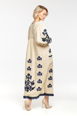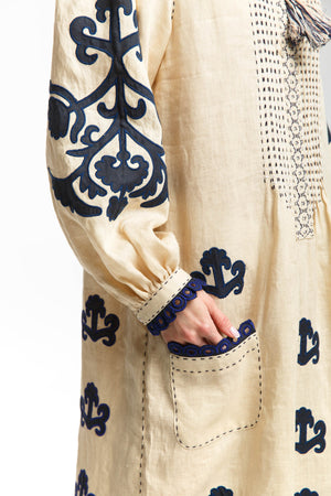 Expertly crafted with ivory linen and intricate applique embroidery, this fashion-forward dress exudes a touch of Bohemian charm. The front pockets and delicate lace embellishment add functionality and style, while the hand-stitched V-neck pleating creates a unique and elegant look. Each dress is available to order in a variety of colors and lengths, ensuring the perfect fit for any occasion.