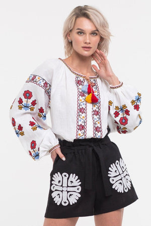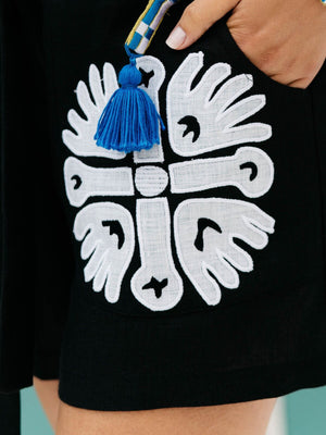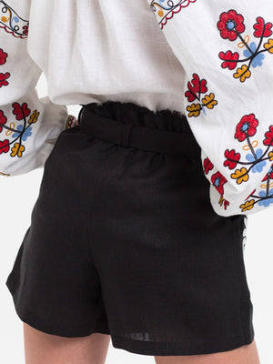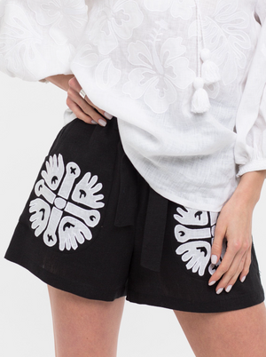 Enhance your summer wardrobe with the addition of these applique embroidered black linen shorts. These high-waisted shorts not only provide functional pockets, but also include a trendy belt for extra style. Embrace a bohemian aesthetic with these one-of-a-kind and chic shorts.