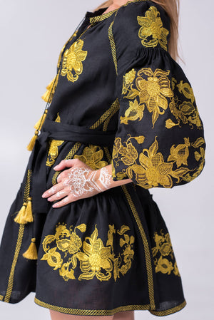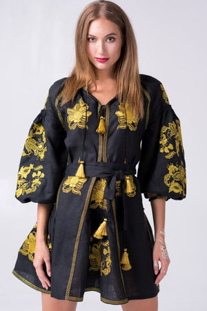 Black boho dress with gold floral embroidery