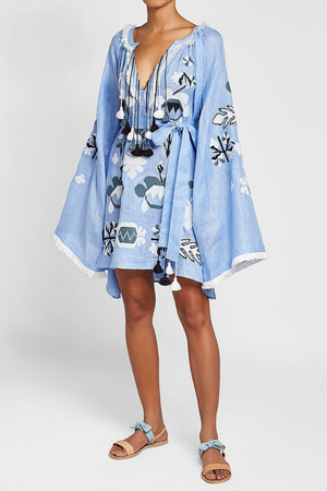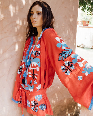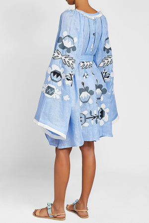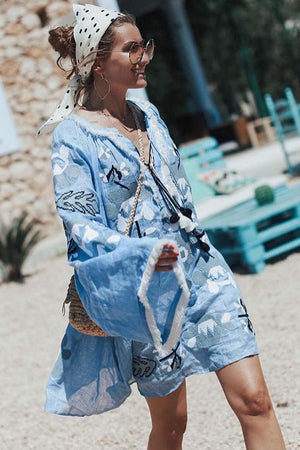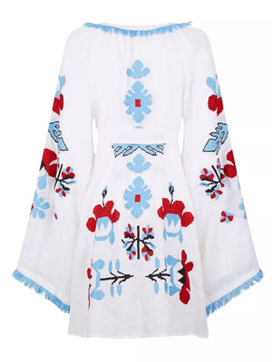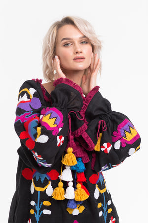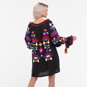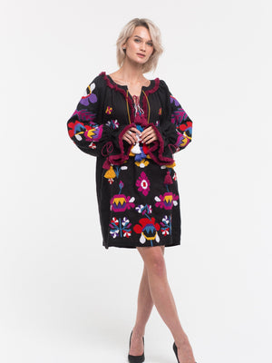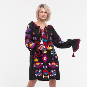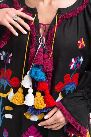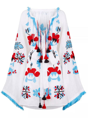 Experience the exquisite craftsmanship of Ukrainian culture with this ethnic embroidered linen tunic dress, a true celebration of global traditions. Handcrafted by skilled artisans, its intricate patterns and vibrant colors make it the perfect choice for any summer occasion. This gypsy-inspired dress is made from high-quality linen and features charming tassels, adding a touch of elegance. Customize the dress to your liking by choosing from a variety of colors and lengths. Available in plus size as well.