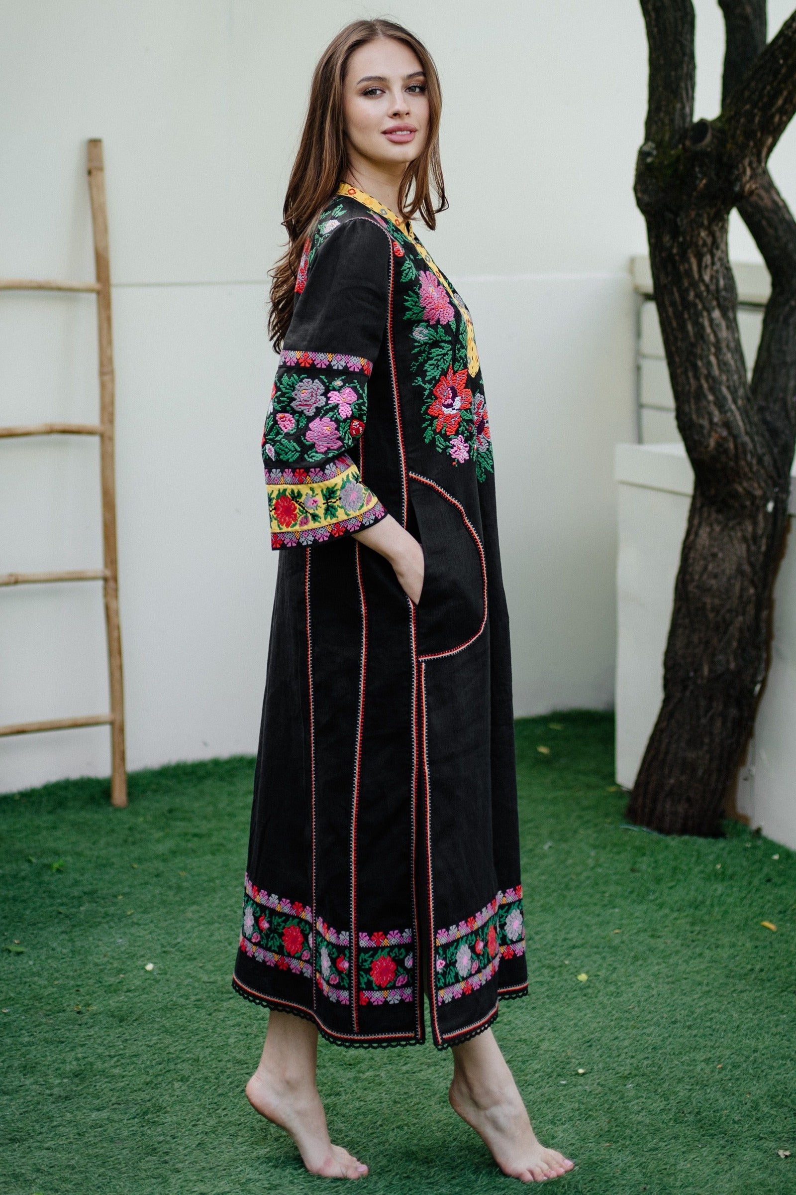 Become a trendsetter with the Lulu black embroidered linen dress. Crafted by skilled Ukrainian artisans, this one-of-a-kind vyshyvanka dress combines diverse global influences with a contemporary style. Perfect for any occasion, it features pockets, a belt, and can be customized in various colors.