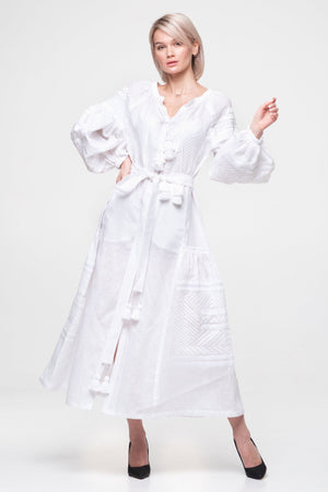 Experience the liberated atmosphere of this genuine Ukrainian dress, made from premium, environmentally-friendly linen and embellished with detailed embroidery. Its adaptable style makes it perfect for any occasion, while the subtle front buttons and functional pockets enhance its refined aesthetic. Acting as a timeless representation of womanhood and happiness, this summer outfit is fitting for a range of events, such as formal gatherings, trips, celebrations, and getaways.