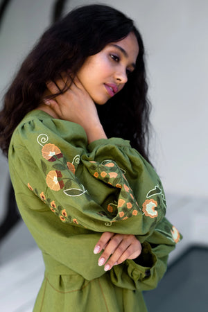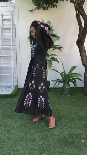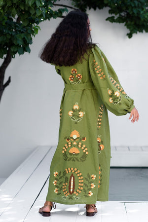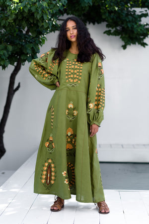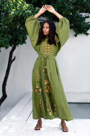 Enhance your fashion game as a trend ambassador with this embroidered linen gown, handcrafted by skilled Ukrainian artisans. This stunning bohemian dress exudes cultural diversity through vibrant embroidery on 100% linen, complemented by a belt and contrast stitching. Embrace a modern, globally-inspired style fit for any occasion.