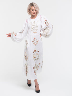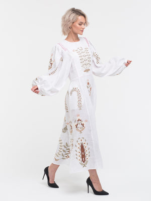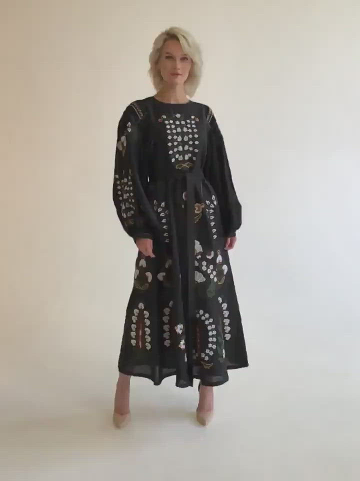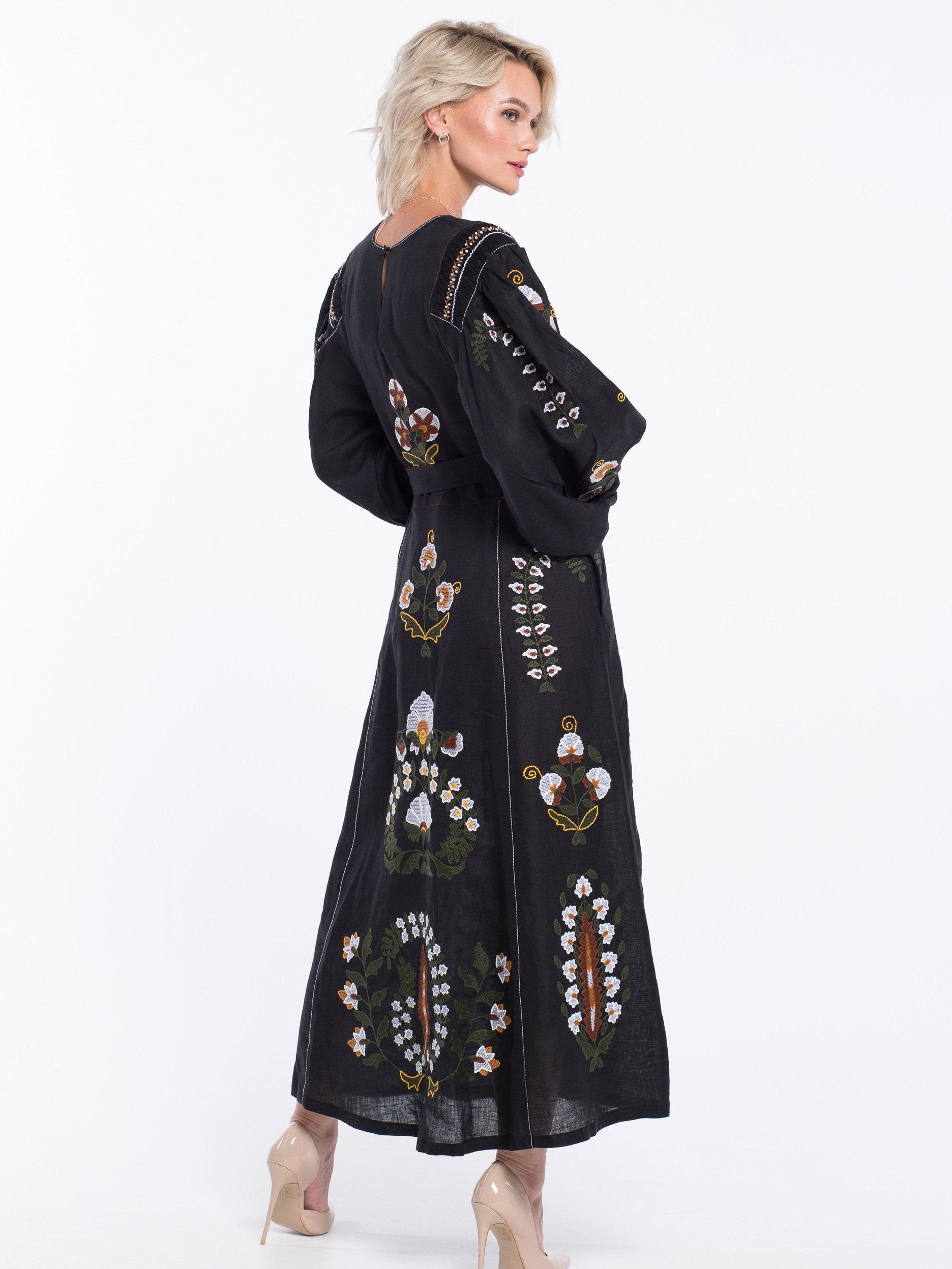 Enhance your fashion game as a trend ambassador with this embroidered linen gown, handcrafted by skilled Ukrainian artisans. This stunning bohemian dress exudes cultural diversity through vibrant embroidery on 100% linen, complemented by a belt and contrast stitching. Embrace a modern, globally-inspired style fit for any occasion.