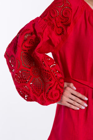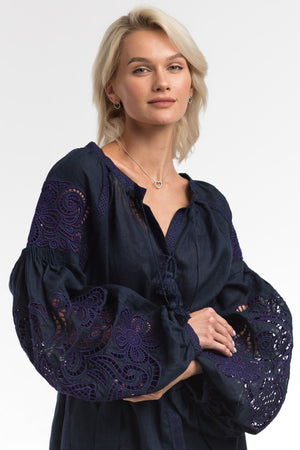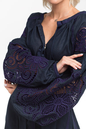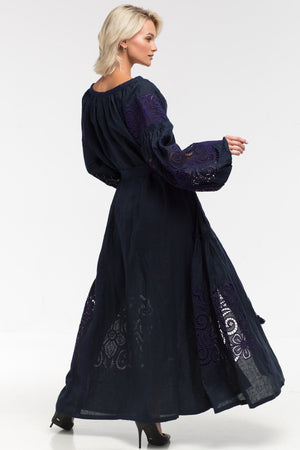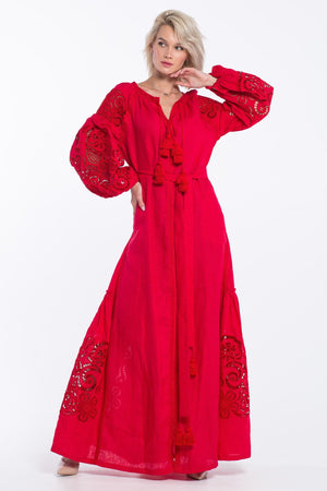 Unite traditional craftsmanship and modern fashion with our richelieu embroidered linen dress. This bohemian dress, hand-crafted by skilled Ukrainian artisans, features intricate embroidery and practical details like pockets, belt, and tassels. Made from 100% linen, it is available for custom orders and perfect for any occasion.