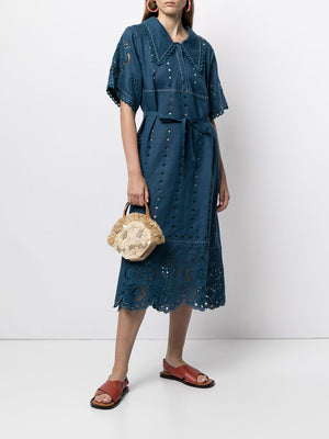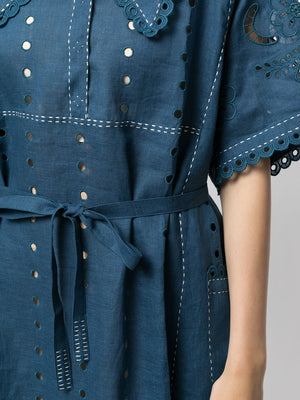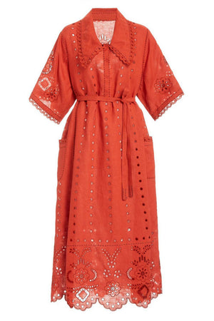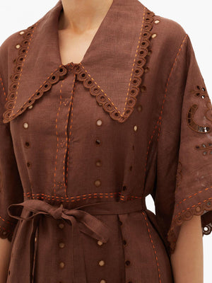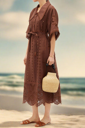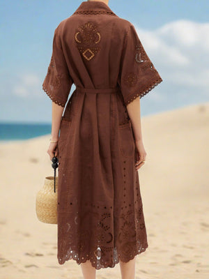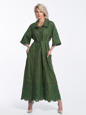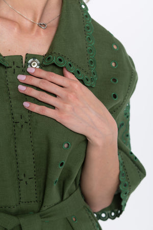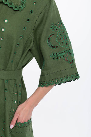 This handcrafted dress made from 100% linen features a beautiful floral richelieu embroidery, convenient pockets, and a stylish belt. Our eyelet robe is customizable in any color. Our team takes great pride in creating boho dresses and ukrainian clothing with meticulous attention and care.