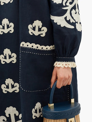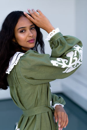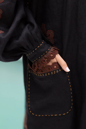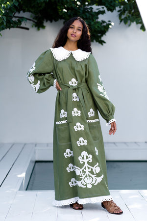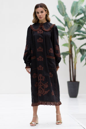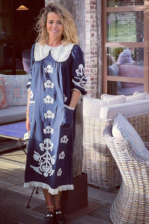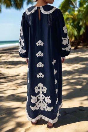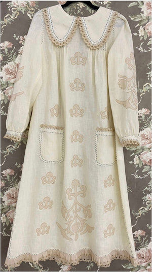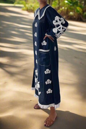 Romantic fashion applique dress with contrast hand stitched embroidery, belt and pockets. Embroidered dress made with lace at the hem and cuffs. Try fashion dress with sandals or boots for bohemian mood.