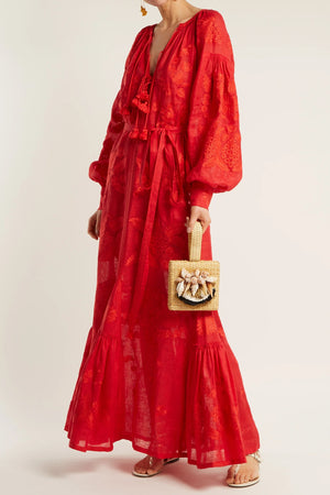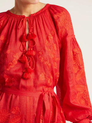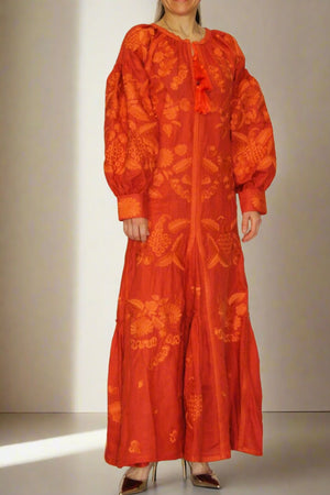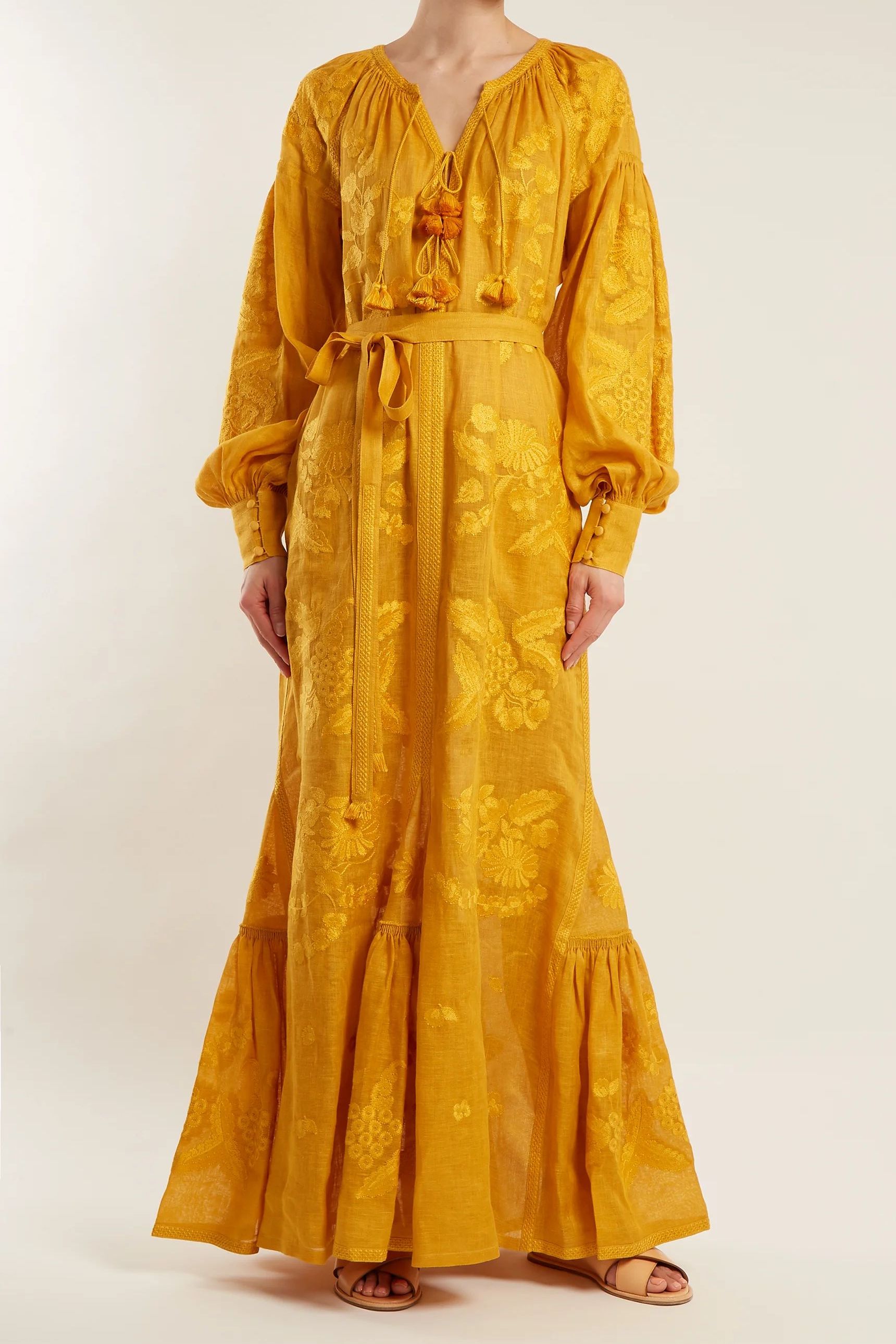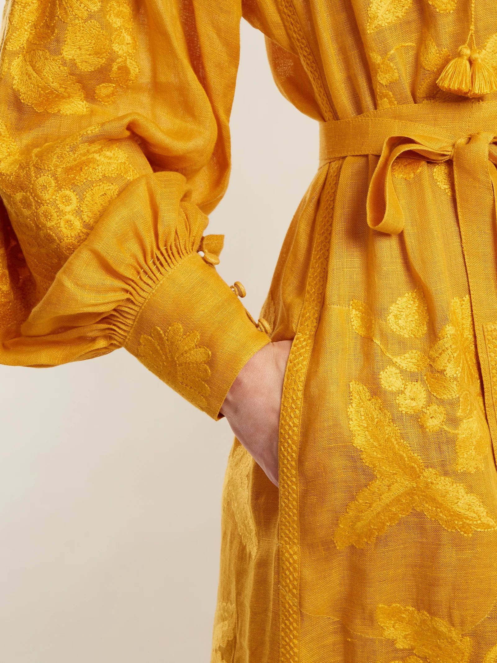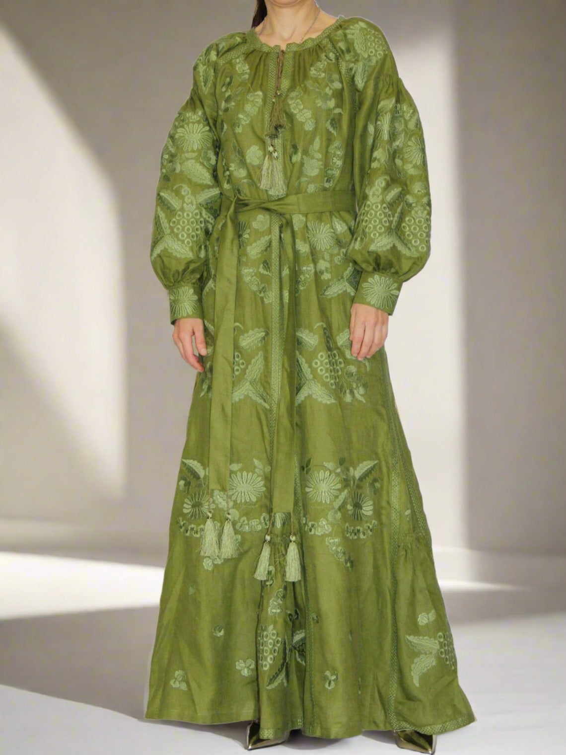 Constructed entirely from 100% linen, this summer dress boasts exquisite monochrome embroidery and includes handy pockets and a belt for both fashion and practicality. Customizable in color and length to suit any preference.