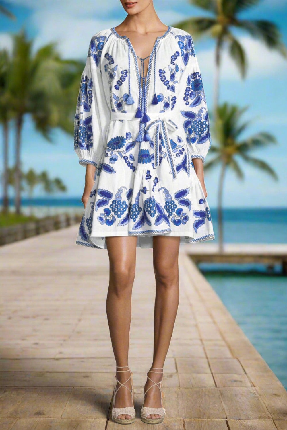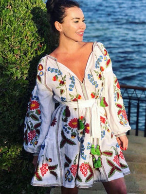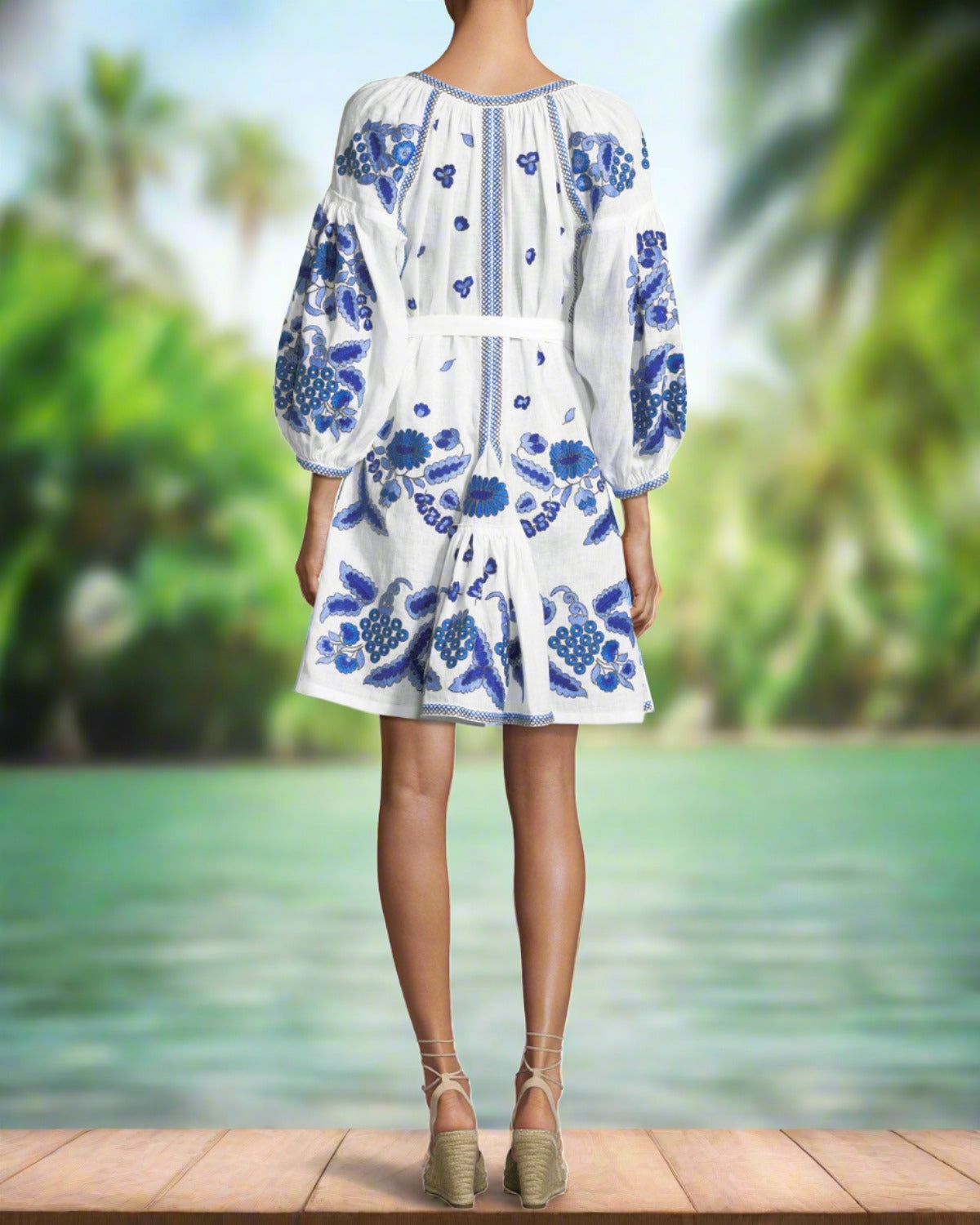 Prepare for a stylish vocation with an embroidered linen dress that combines cultural influences and contemporary fashion. Created by talented Ukrainian artisans, its versatility and elegance make it a perfect choice for any destination or resort getaway.