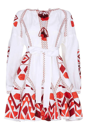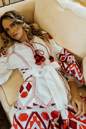 Indulge in the luxury of our white linen bohemian dress, adorned with delicate pom-poms at the V-neckline. This exquisite summer gown boasts intricate embroidery and can be customized in an array of stunning colors and lengths.