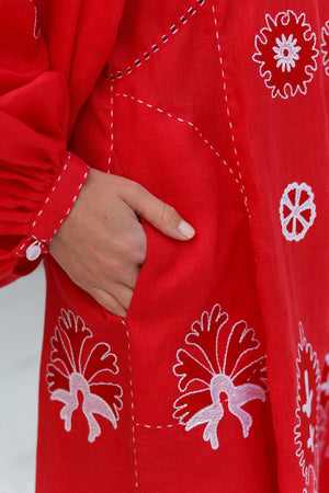 Embrace the essence of adventure and cross-cultural understanding with a hand-embroidered linen dress meticulously crafted by skilled artisans from Ukraine. Its vivid hues and elaborate designs, influenced by various global cultures, make it the perfect option for your upcoming summer getaway. This bohemian kaftan dress is adorned with pockets, a belt, and finely hand-sewn accents. Elevate your wardrobe with a stunning custom linen ensemble, available in a range of colors and lengths.