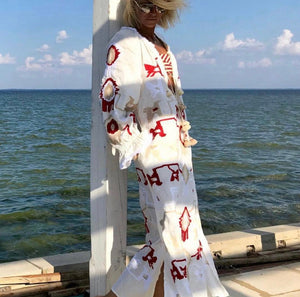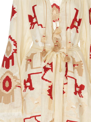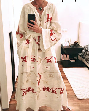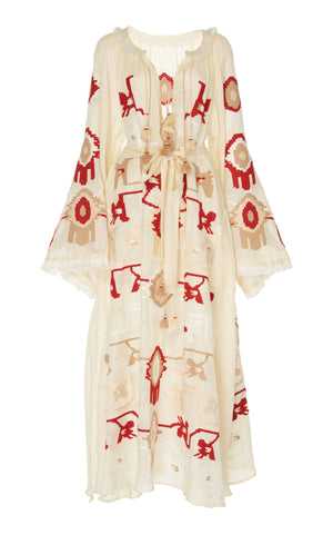 Embroidered ivory linen dress with floral embroidery Bohemian beach gown