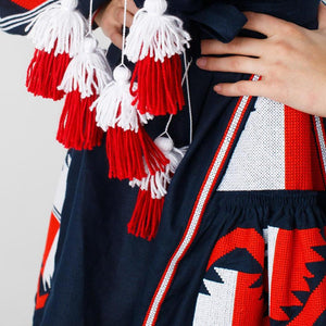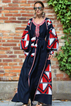 Crafted with meticulous attention and care, our embroidered dress exudes a Bohemian vibe and features traditional Ukrainian embroidery on high-quality navy blue linen. With hidden front buttons, a belt, and pockets, this unique dress is also customizable in terms of color and length, making it a perfect tribute to our valued customers.