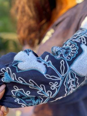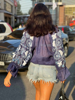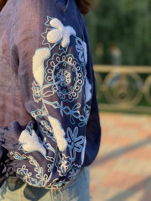 Beautiful and chic embroidered shirt, vyshyvanka for woman crafted from navy blue gauze linen. Fashion ethnic loose top can be made in any colors or length.