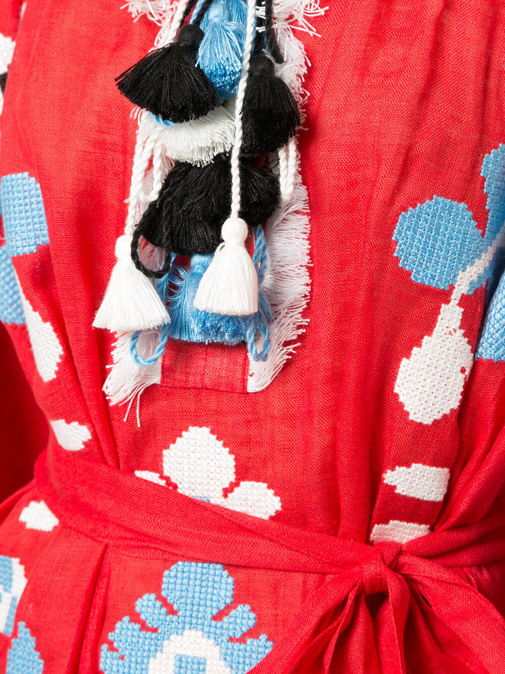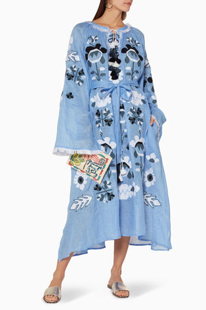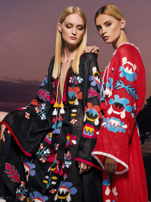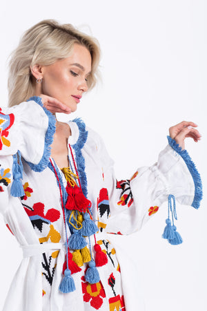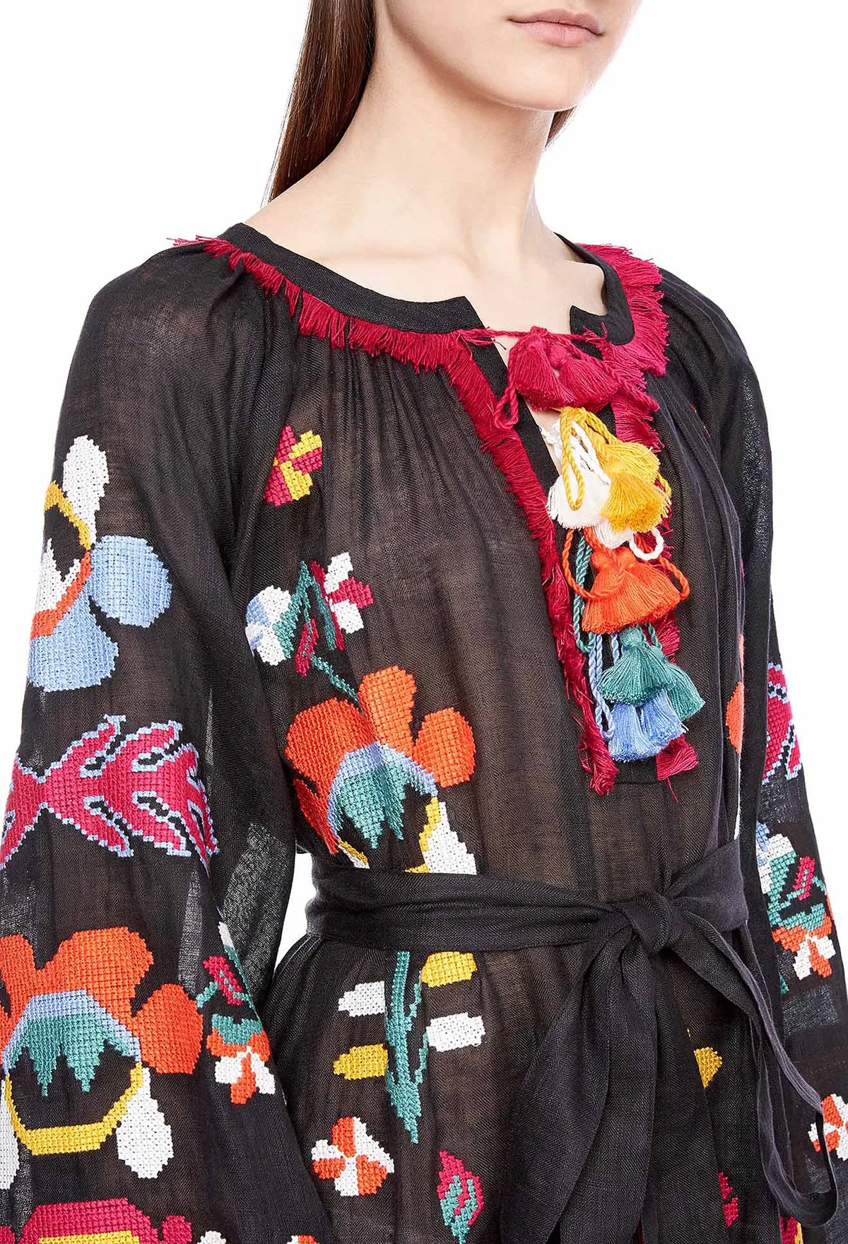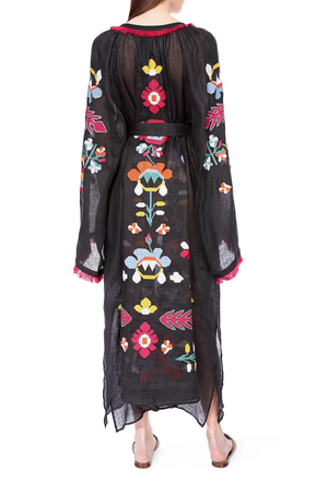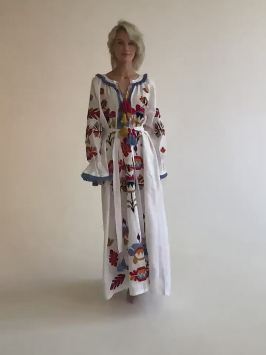 Expertly crafted from high-quality linen, this bohemian kaftan features beautiful tassel embellishments on the cuffs and V-neck. Perfect for evening weddings, this dress can be made in a variety of colors and lengths. The delicate floral embroidery on this dress adds a touch of elegance and style.