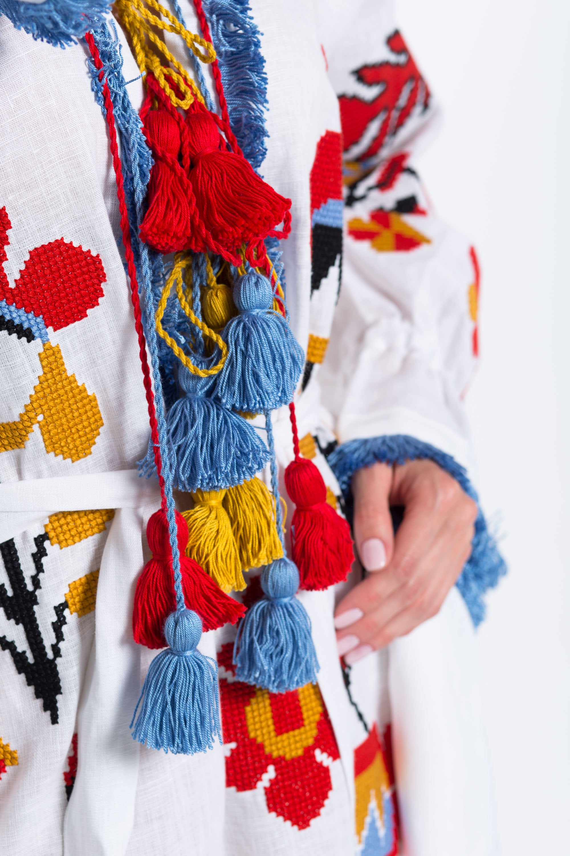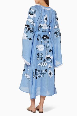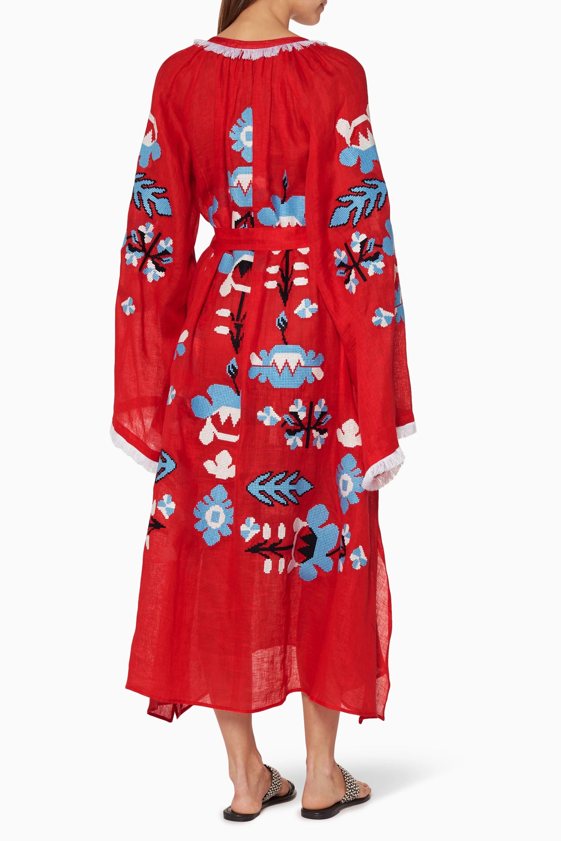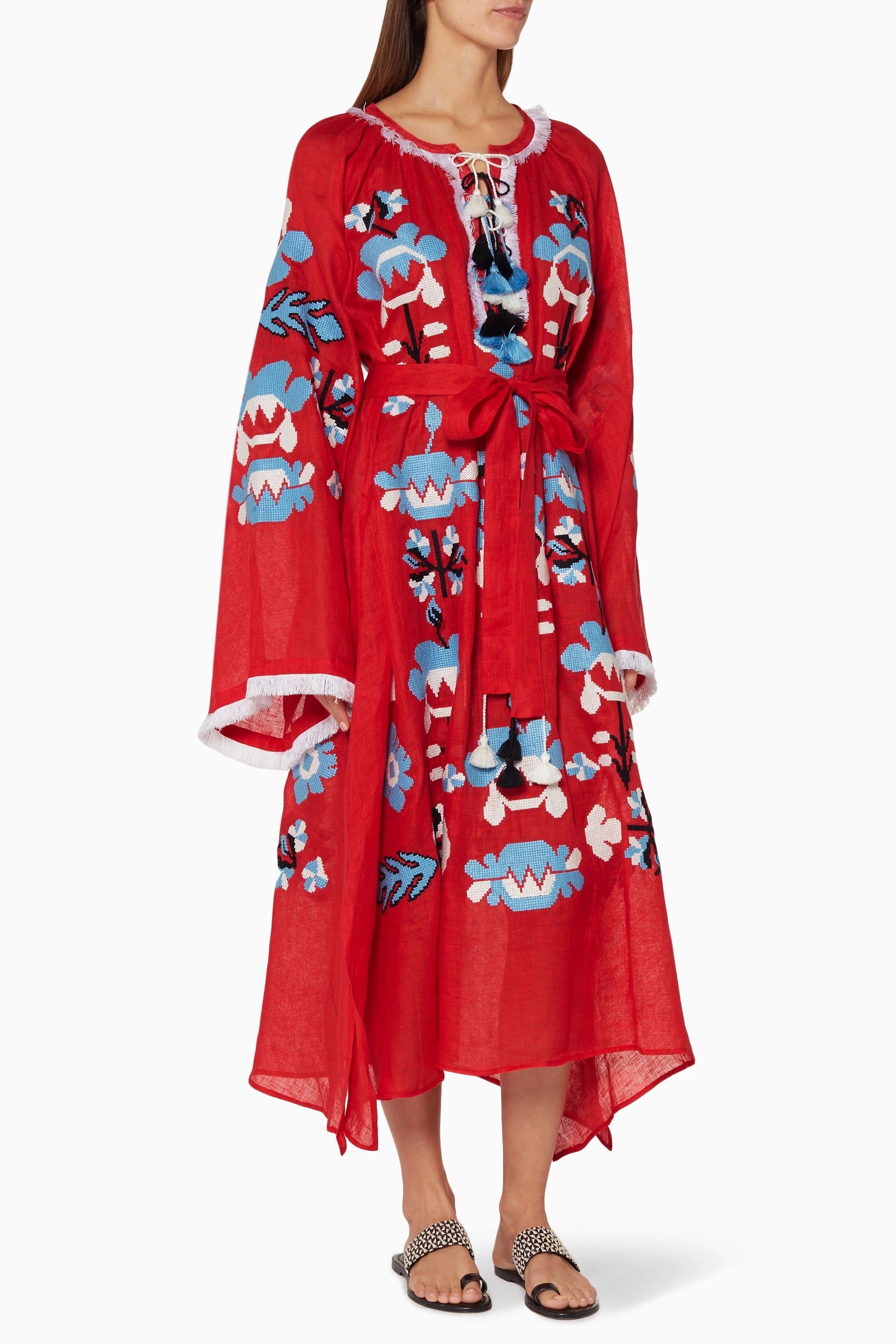 Expertly crafted from high-quality linen, this bohemian kaftan features beautiful tassel embellishments on the cuffs and V-neck. Perfect for evening weddings, this dress can be made in a variety of colors and lengths. The delicate floral embroidery on this dress adds a touch of elegance and style.
