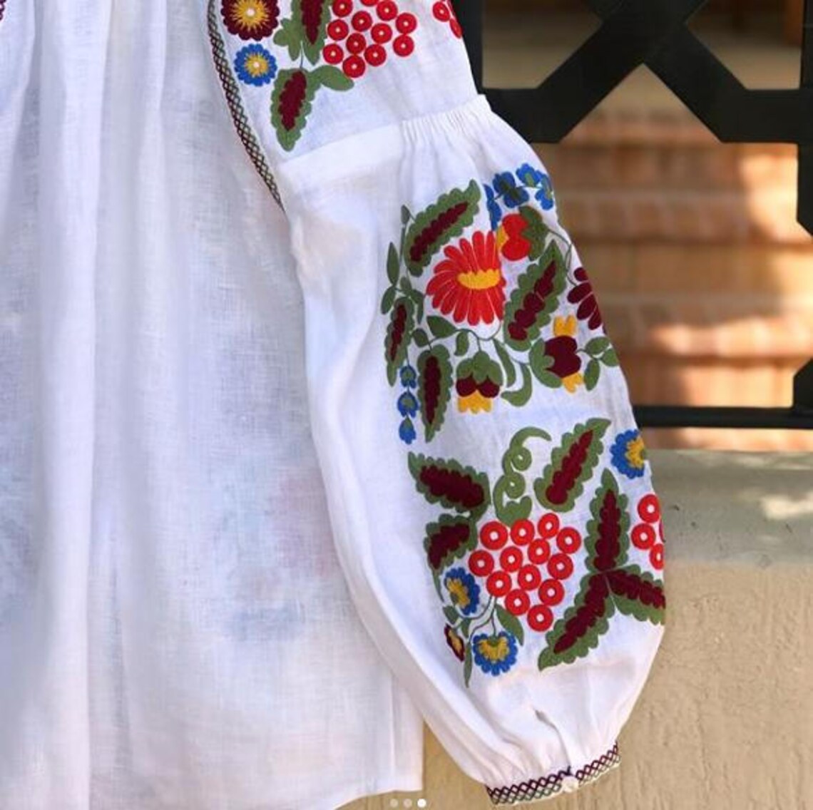 This trendy Bohemian top is made from white linen, featuring a V-neck with hidden front buttons and tassels. The intricate embroidery adds a touch of Ukrainian flair and elegance to this stylish vyshyvanka.