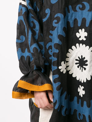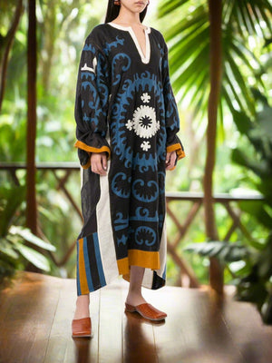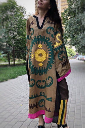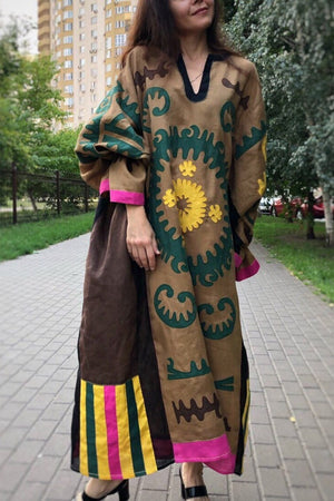 This linen kaftan features hand-applied embroidery, and side pockets. Made of high-quality linen, the maxi dress has a color-block accent on the sides. It is available in custom sizes and can be ordered in different colors and lengths to suit your preferences. This Ukrainian boho dress is perfect for any journey.