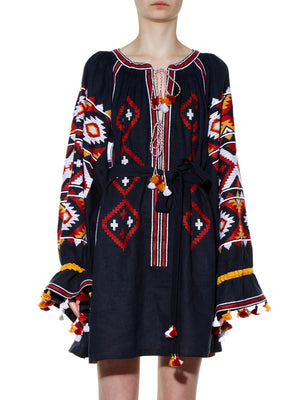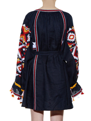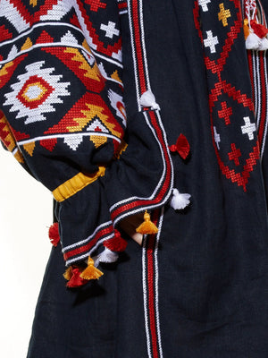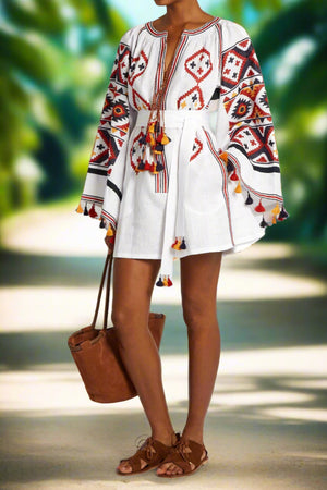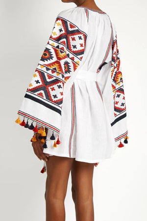 This tunic dress, made with white linen and featuring pockets and a belt, embodies the traditional Ukrainian style known as Vyshyvanka. Its deep V-neck and cuffs are adorned with colorful tassels, adding a touch of vibrance to the garment. Further customization is available upon order, allowing for a choice of colors and length.