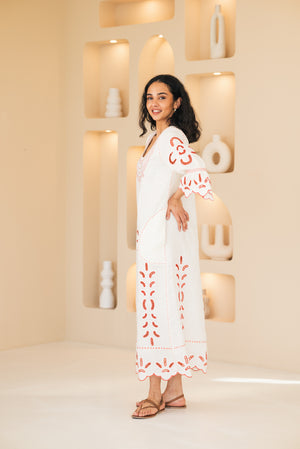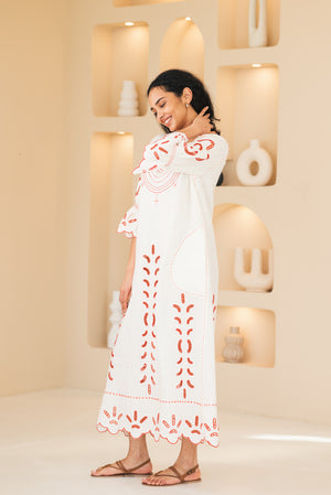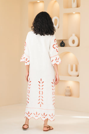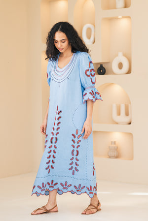 Custom-made with 100% linen, this eyelet embroidered linen dress is the perfect choice for any bohemian babe. Complete with pockets and eyelet detailing, this dress comes in various colors and lengths, providing a unique and versatile option for any occasion.