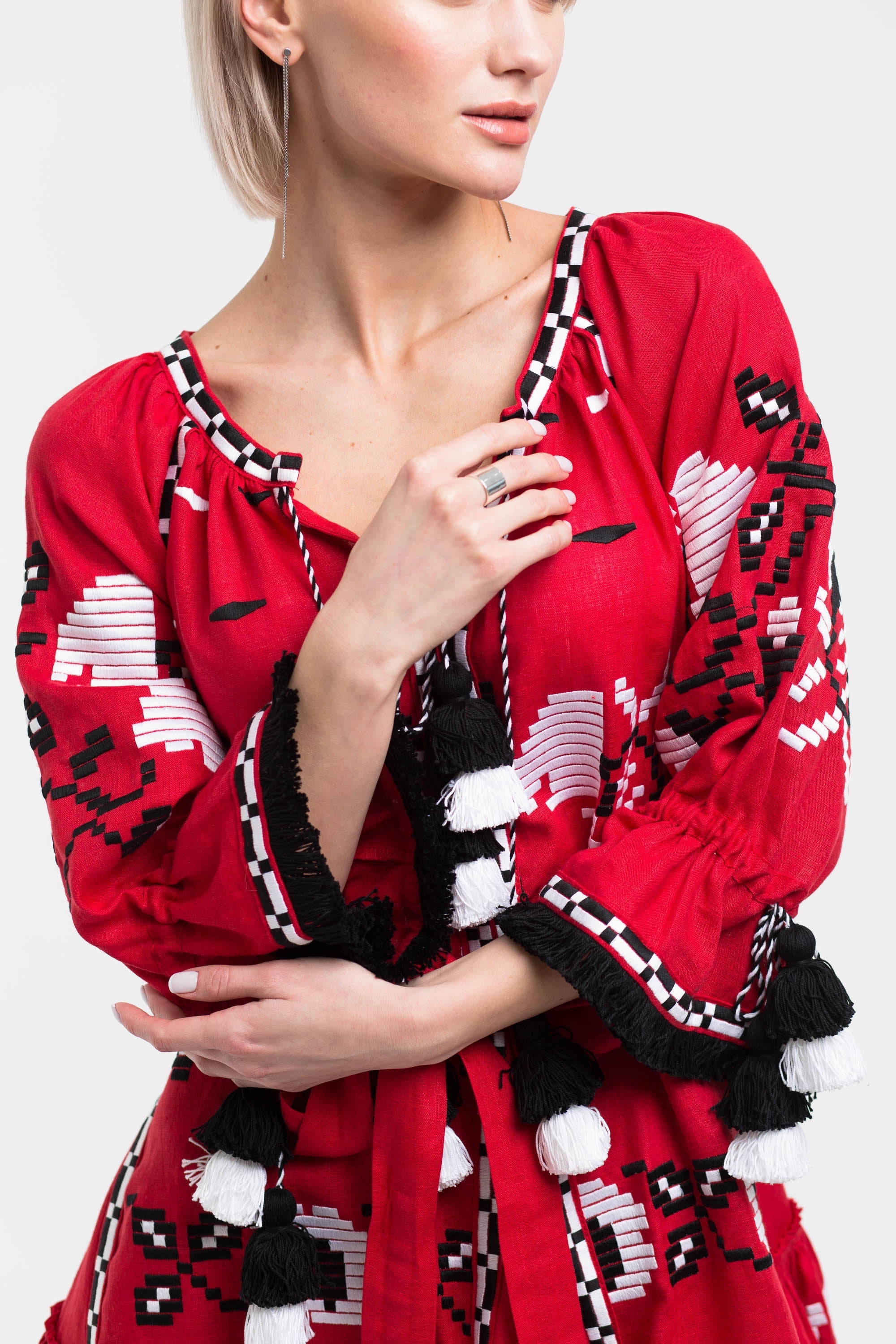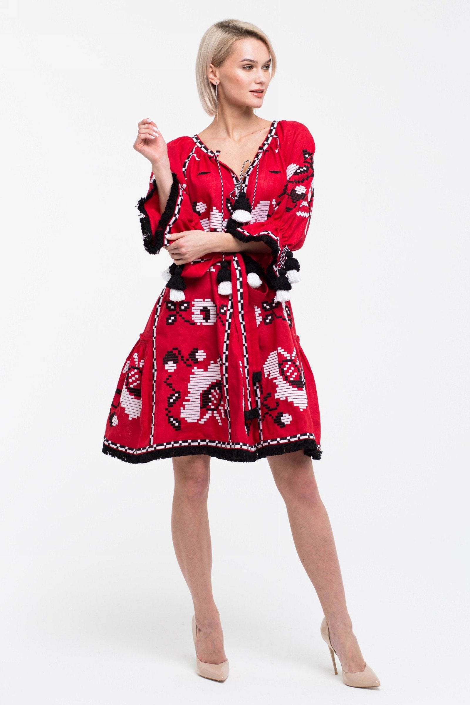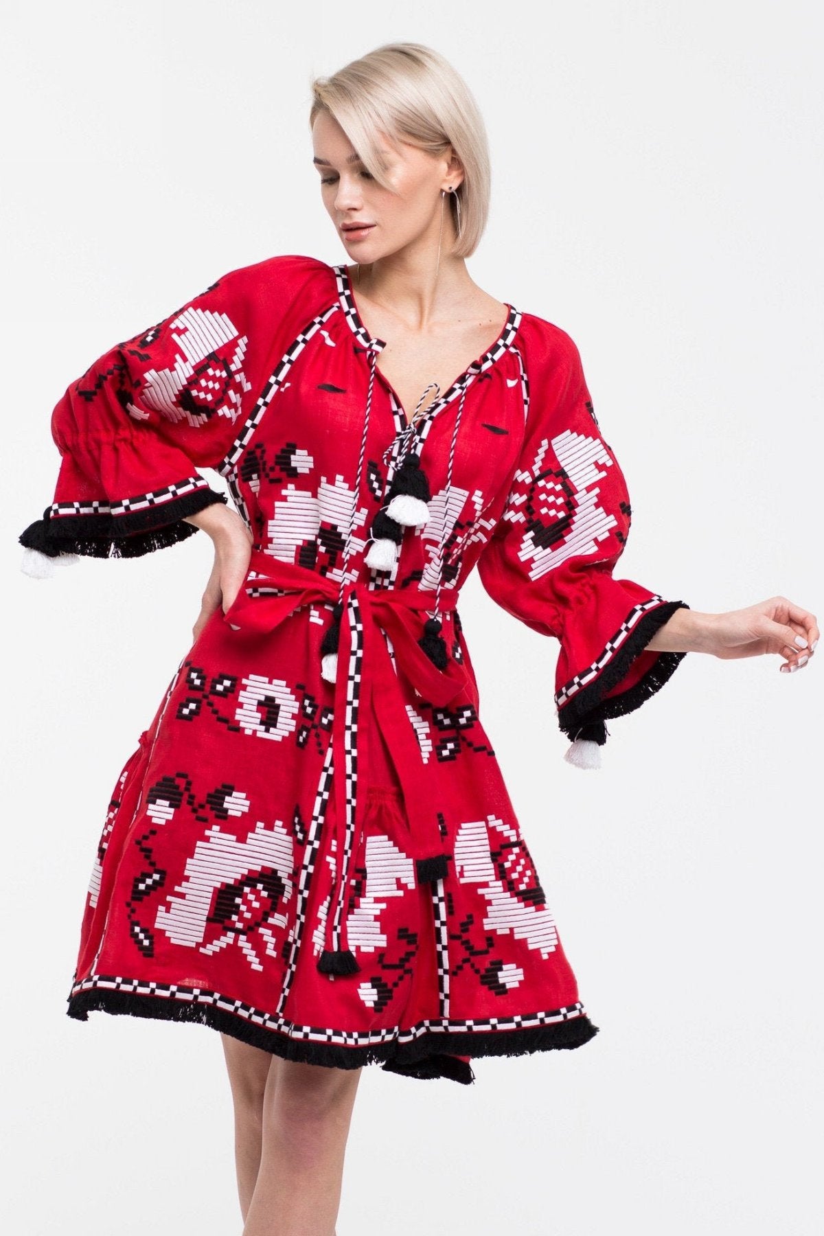 This sophisticated bohemian dress features exquisite poppy embroidery, providing a touch of elegance. Its trendy pockets and delightful tassels make it a must-have for any wardrobe.
