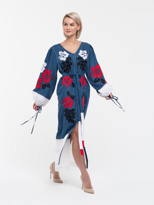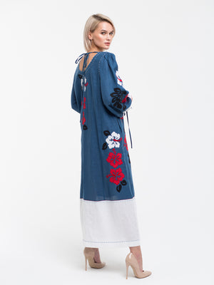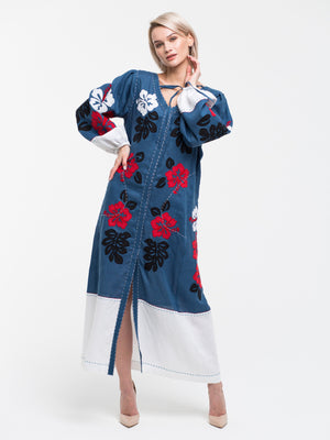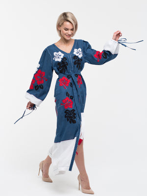 This embroidered kaftan is made from high-quality blue linen and adorned with stylish white details. It boasts elegant tie cuffs and a flattering V-back design. The dress can be tailored to your liking, with options for custom colors and lengths, while showcasing a beautiful floral Ukrainian motif. Practical pockets and a chic belt complete the refined look, making it a must-have piece in your collection.