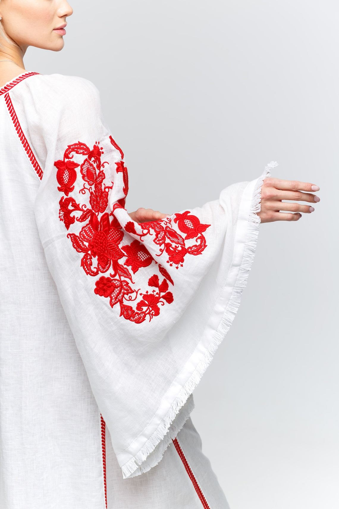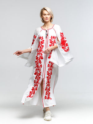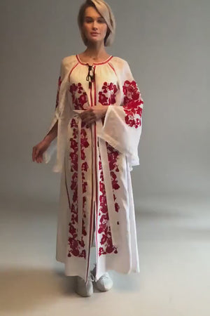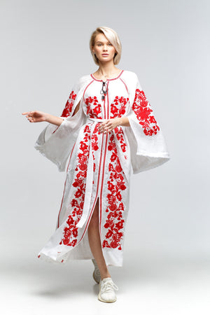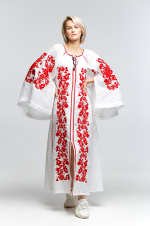 This bohemian dress exudes elegance and style, crafted from a stunning white linen material. Featuring hidden front buttons, a belt, and convenient pockets, this vyshyvanka dress is versatile and chic. With the option to customize the color and length of the dress, it can be tailored to suit any personal preference.