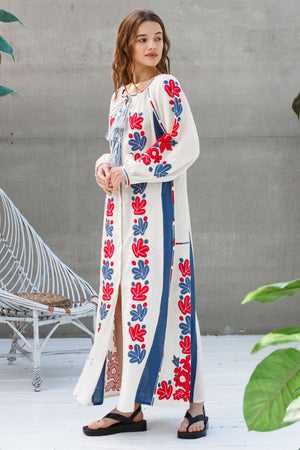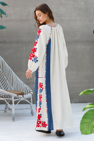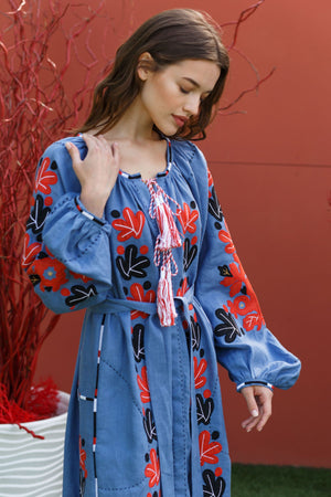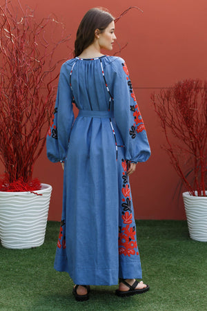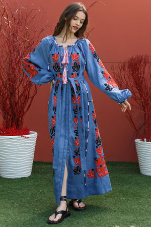 Experience the refined grace of our embroidered linen dress with applique Leaves, carefully handmade with 100% linen material and embellished with intricate embroidery. This bohemian wedding attire includes practical side pockets and a bold belt and can be tailored to your preference in color and length. Enhance your fashion with this exquisite Ukrainian-inspired work of art.