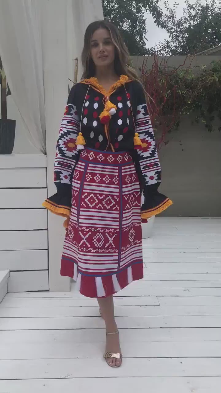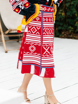 Upgrade your wardrobe with our exquisite red linen embroidered midi skirt. Made from high-quality materials, this skirt features handmade tassels and is perfect for any occasion, from weddings to parties to birthday celebrations. Elevate your style with a touch of ethnic Ukrainian fashion.