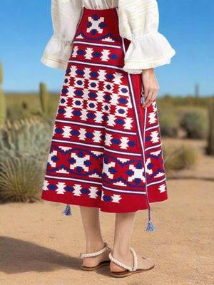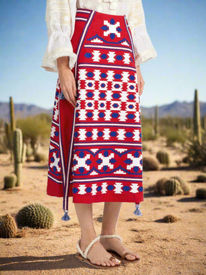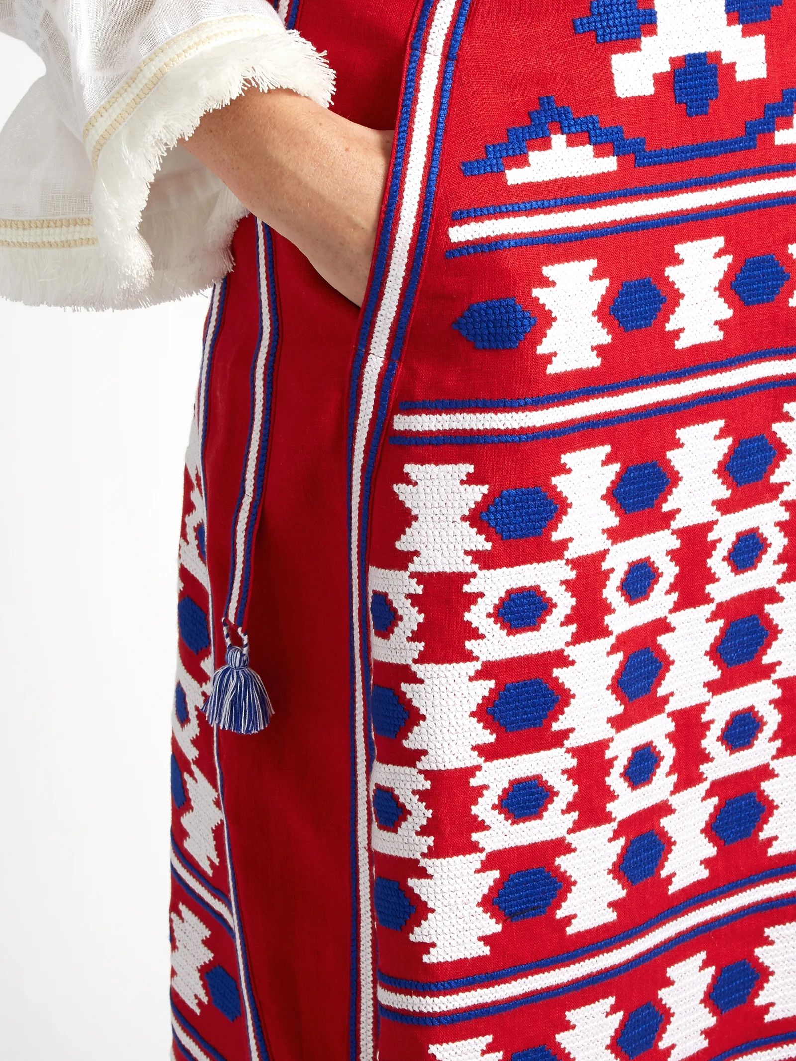 One-of-a-kind peasant bohemian skirt crafted in red linen with white - blue embroidery Mexico. Embroidered linen skirt made with side hidden zipper and A-line silhouette.