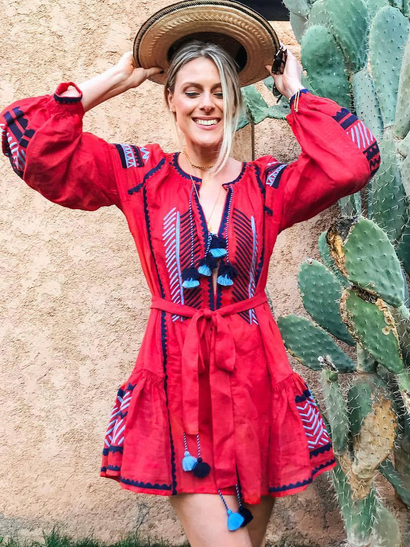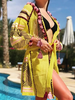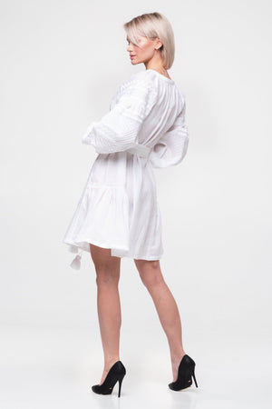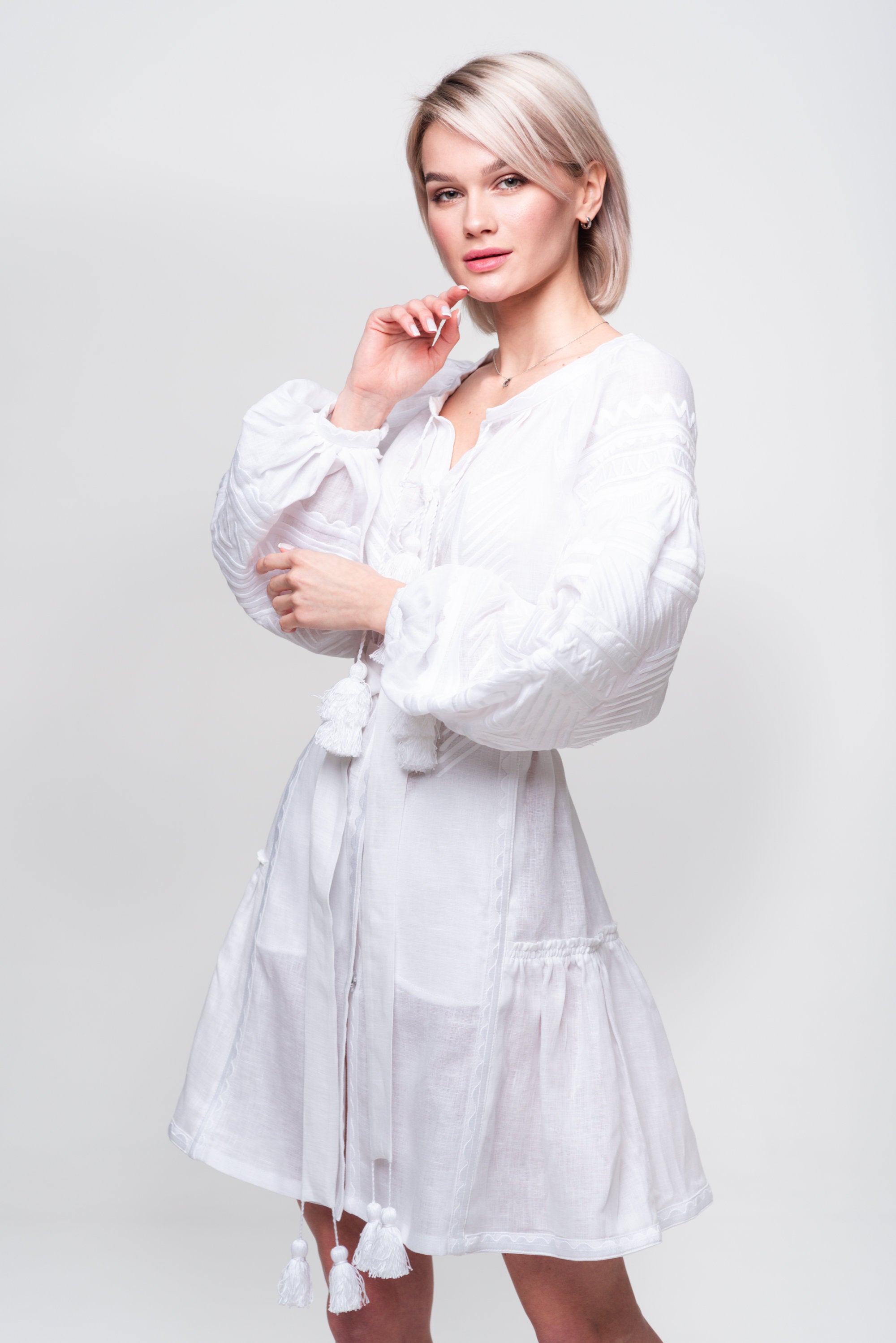 This ethnic-inspired dress is crafted from premium white linen and features intricate embroidery and tassels. Designed in a traditional style, it embodies the concepts of beauty, health, love, and happiness for women. With customizable options for color and length, it is suitable for any occasion, from birthdays to vacations or travel.