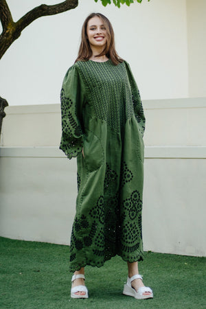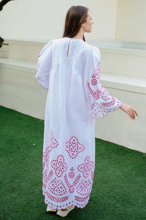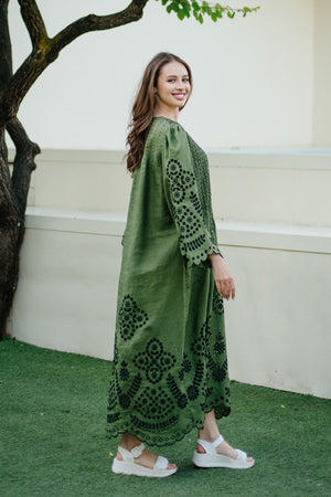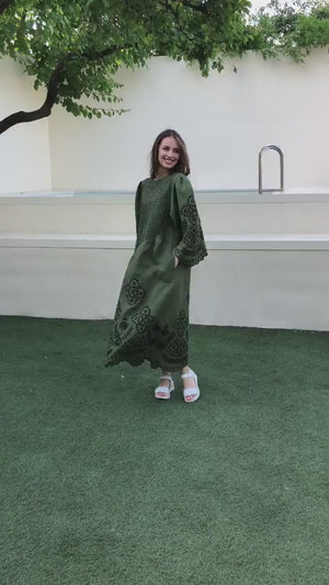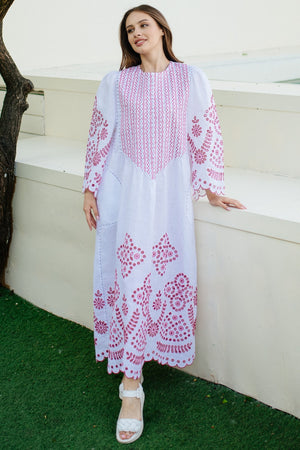 Enhance your attire with the addition of this beautiful linen dress, skillfully crafted to exude elegance and sophistication. Admire its timeless charm, highlighted by delicate hand-cut embroidery, practical pockets, and a belt. This unique fashion bohemian dress, is made of linen and embellished with richelieu embroidery.