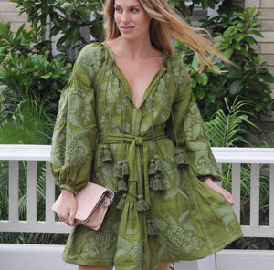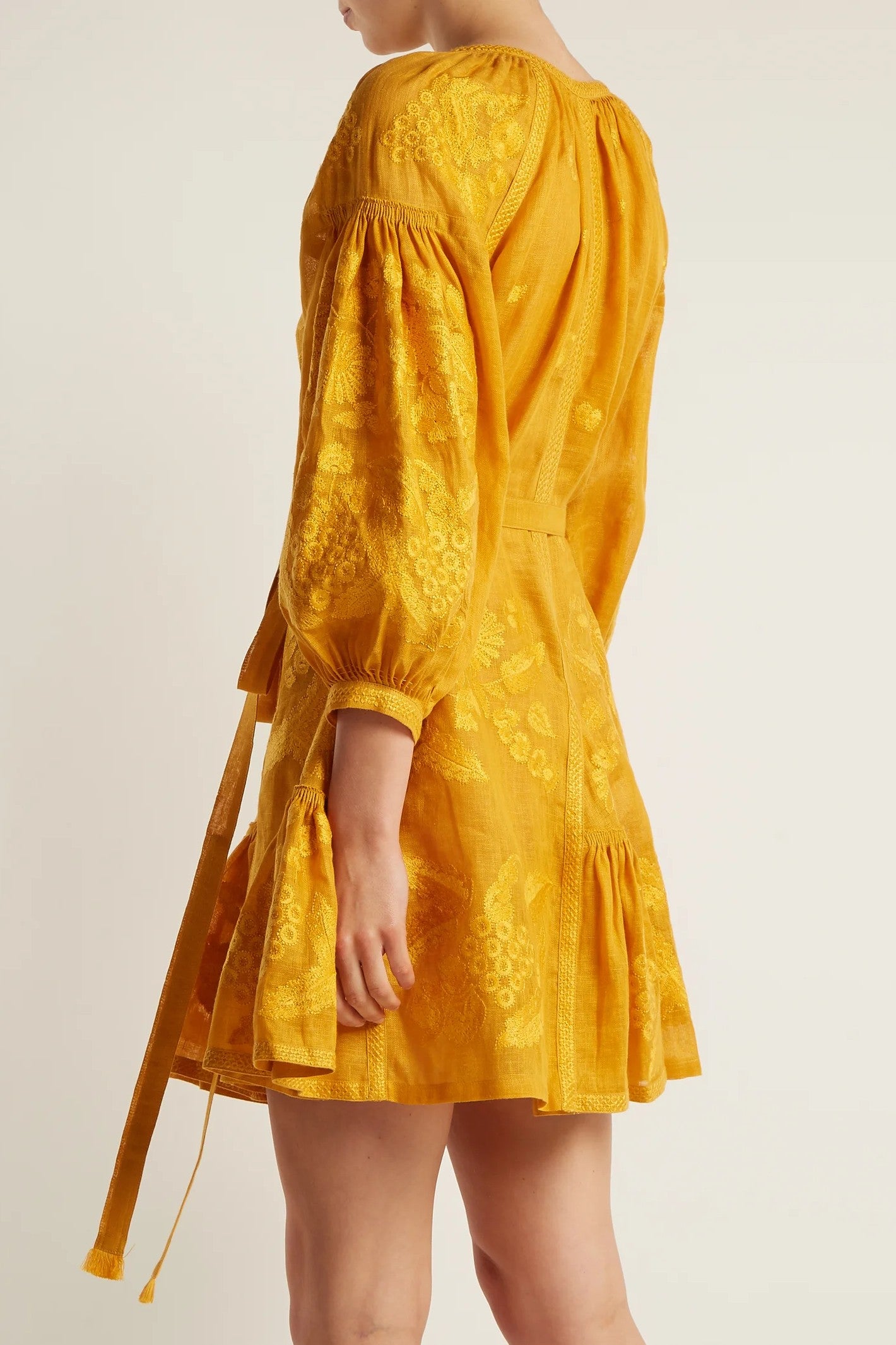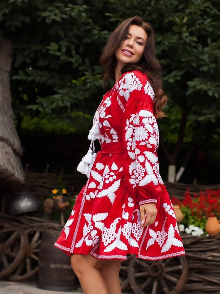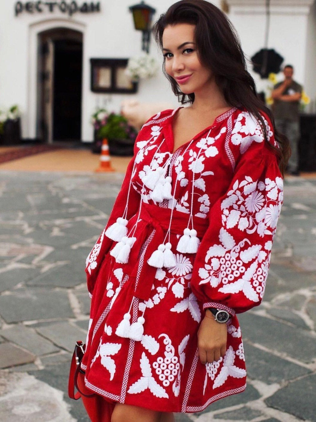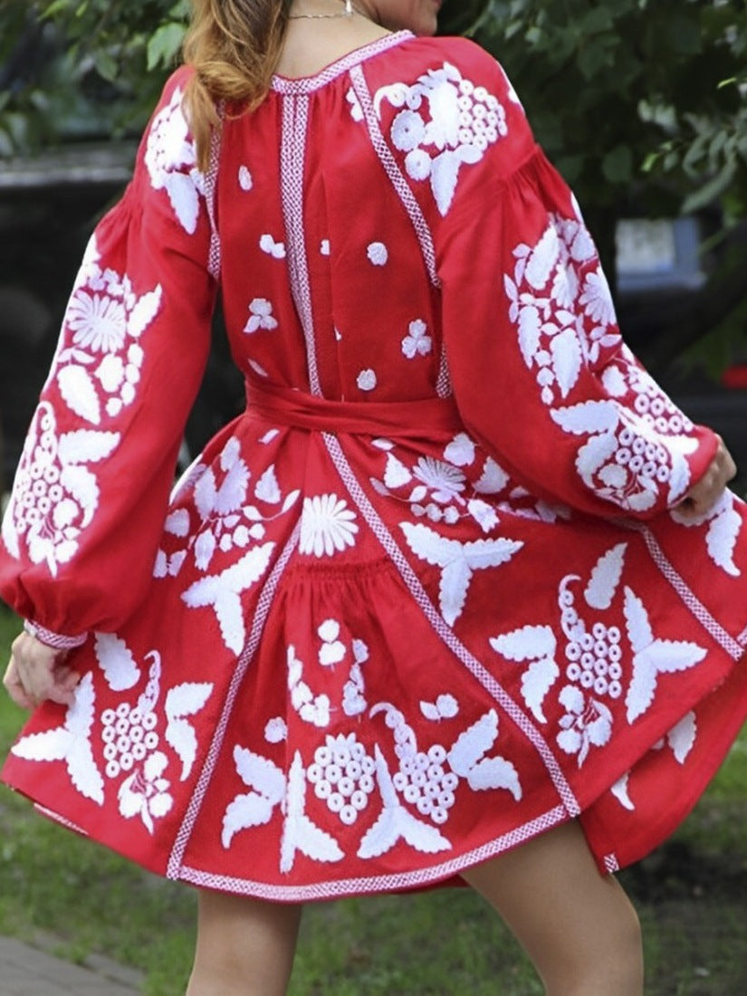 Meticulously crafted by skilled artisans from Ukraine, this dress showcases elaborate embroidery that captivates with its detail and artistry. Whether for a memorable gathering, a leisurely outing, or a vacation escape, this exquisite garment boasts monochrome grape motifs intricately stitched onto its fabric, complete with practical pockets and a coordinating belt. Radiating bohemian allure, this dress can be tailored in a spectrum of colors and lengths to perfectly match your style.