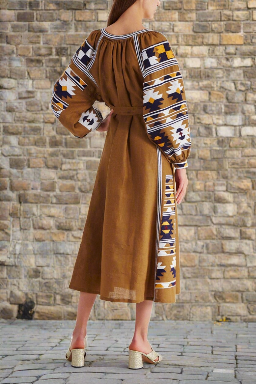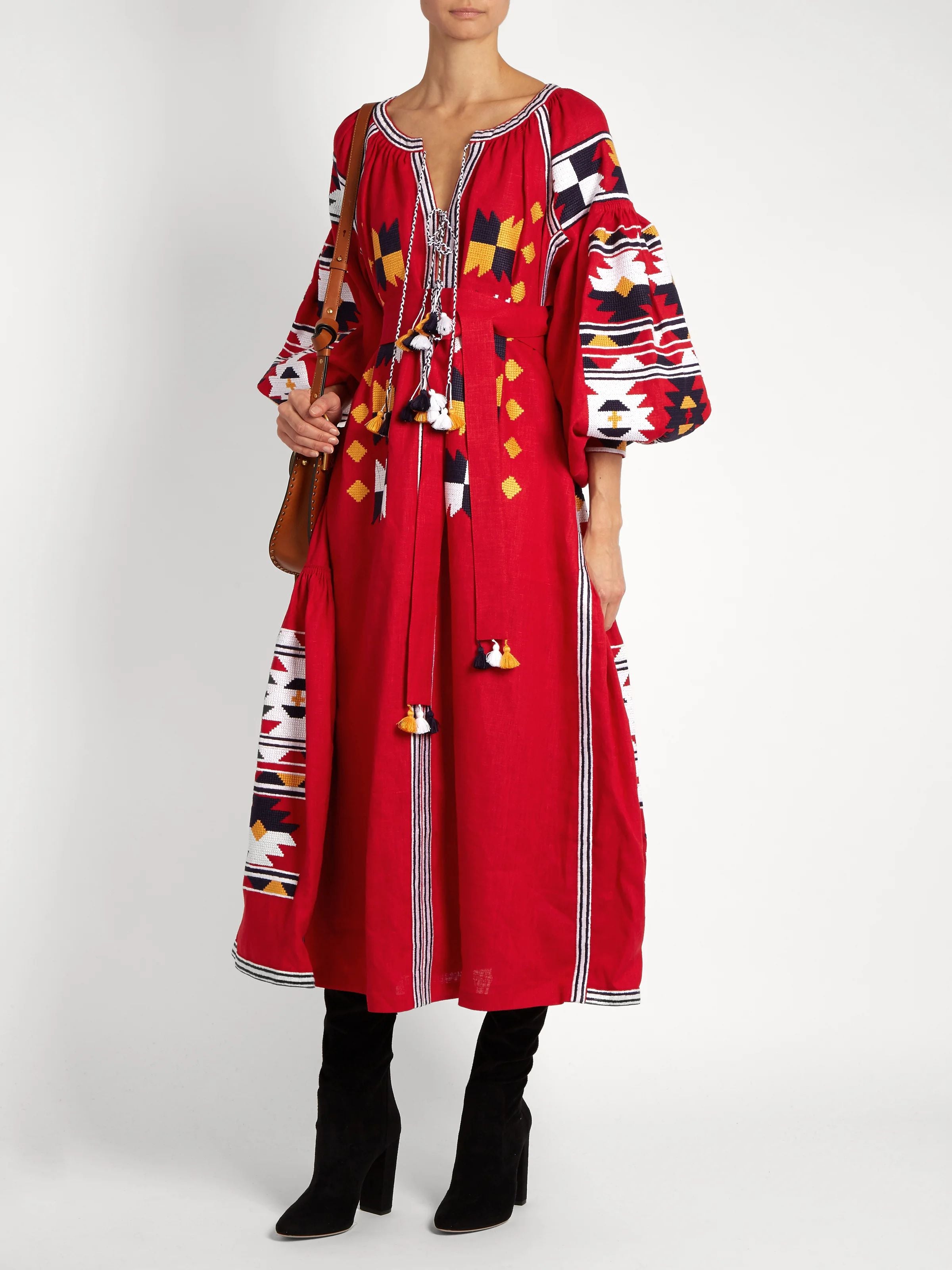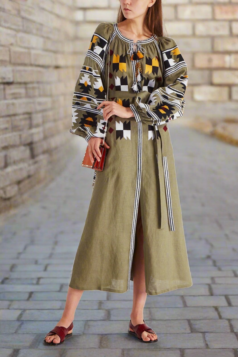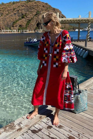 This gorgeous linen maxi dress boasts expert craftsmanship, highlighted by intricate bohemian embroidery and a V-neck adorned with charming tassels. Its versatile design allows for customization of both color and length, making it an ideal summer kaftan robe.