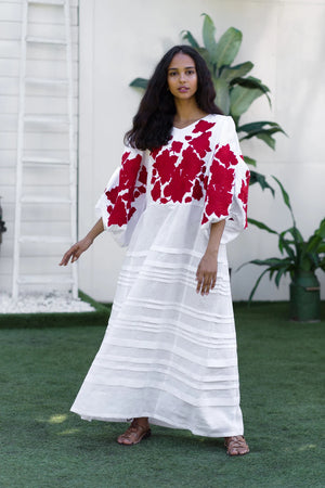 This elegant vyshyvanka dress features stunning floral embroidery, oversized balloon sleeves, convenient pockets, and a matching belt. The versatile bohemian wedding gown can be customized with any color and length options.