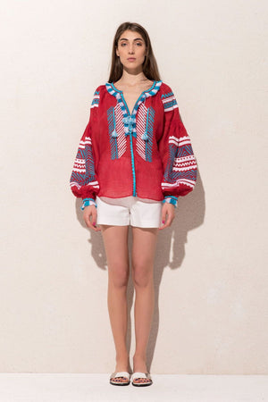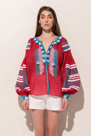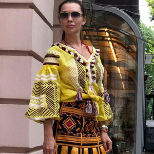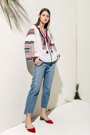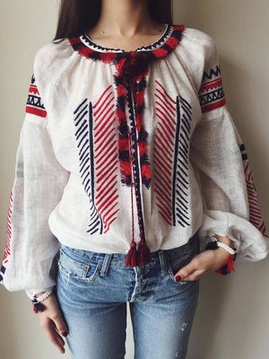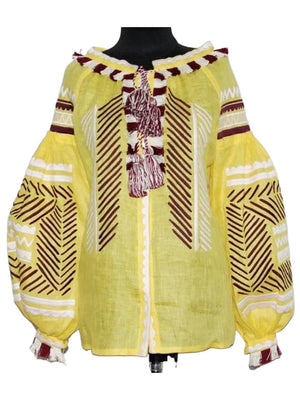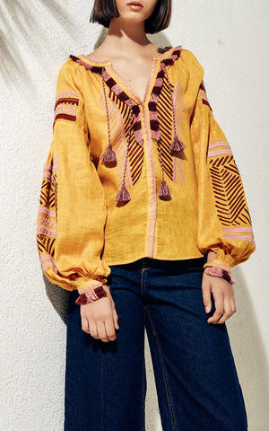 Crafted from sun linen with tassels adorning the neckline and cuffs, this sheer boho shirt features one-of-a-kind embroidery in a variety of colors and lengths. Handmade with expert craftsmanship, this loose blouse top is a truly unique addition to any wardrobe.