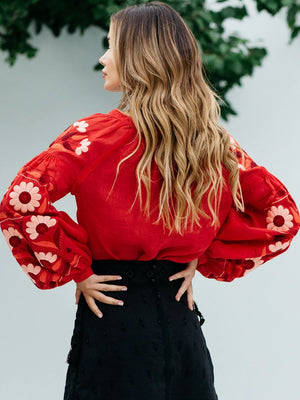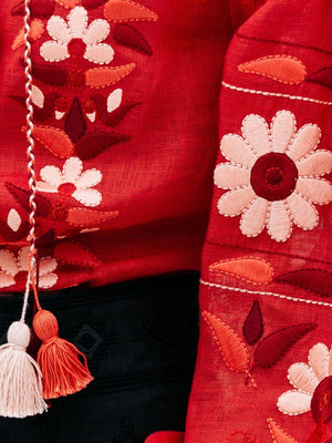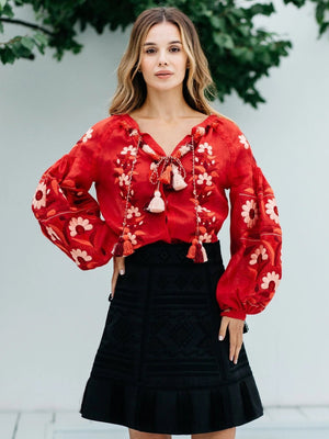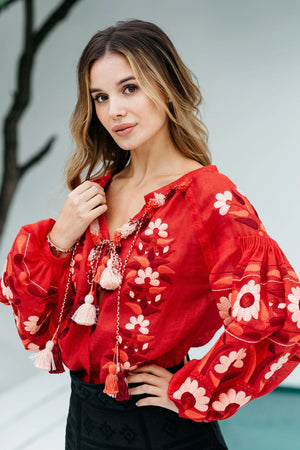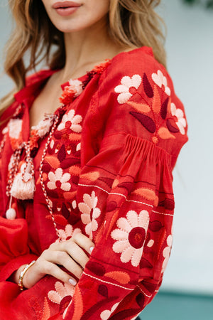 Unique embroidered custom linen shirt, summer loose blouse top crafted in see through red linen with pom-poms at deep V-neck. Beach boho blouse can be made in any colors and length. Sheer linen blouse, Vyshyvanka with Ukrainian embroidery