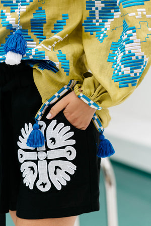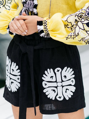 Sale price$198.00 USD - Applique embroidered black linen shorts