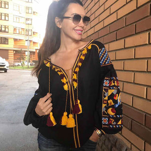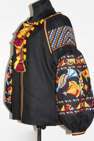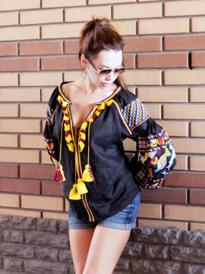 Fashion bohemian loose blouse top, custom embroidered shirt crafted from black linen with pom-poms at deep V-neck. Can be made in any colors and length. Ukrainian black boho blouse, vyshyvanka with fairy Ukraine embroidery