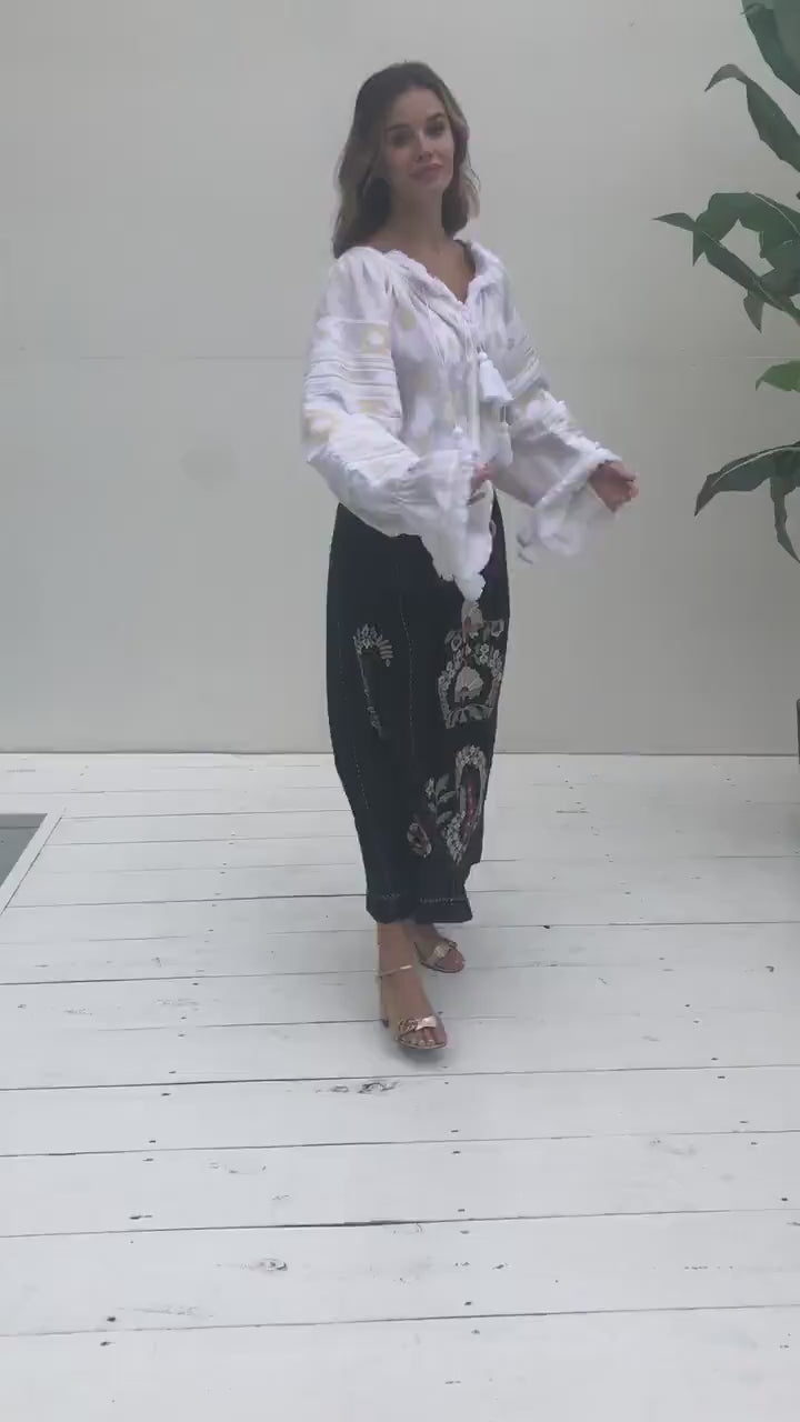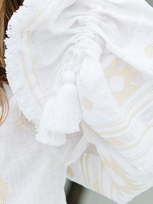 Unique embroidered bohemian shirt, summer beach peasant blouse crafted from white linen with tassels at deep V-neck and tassels on the front buttons. Available to order in any colors and length. White boho blouse plus size, vyshyvanka with ethnic Ukrainian embroidery