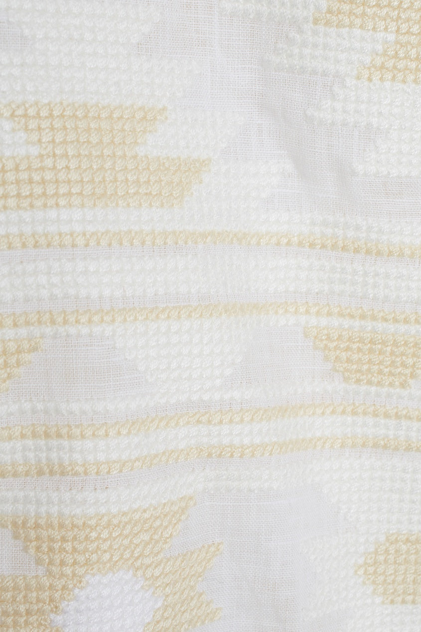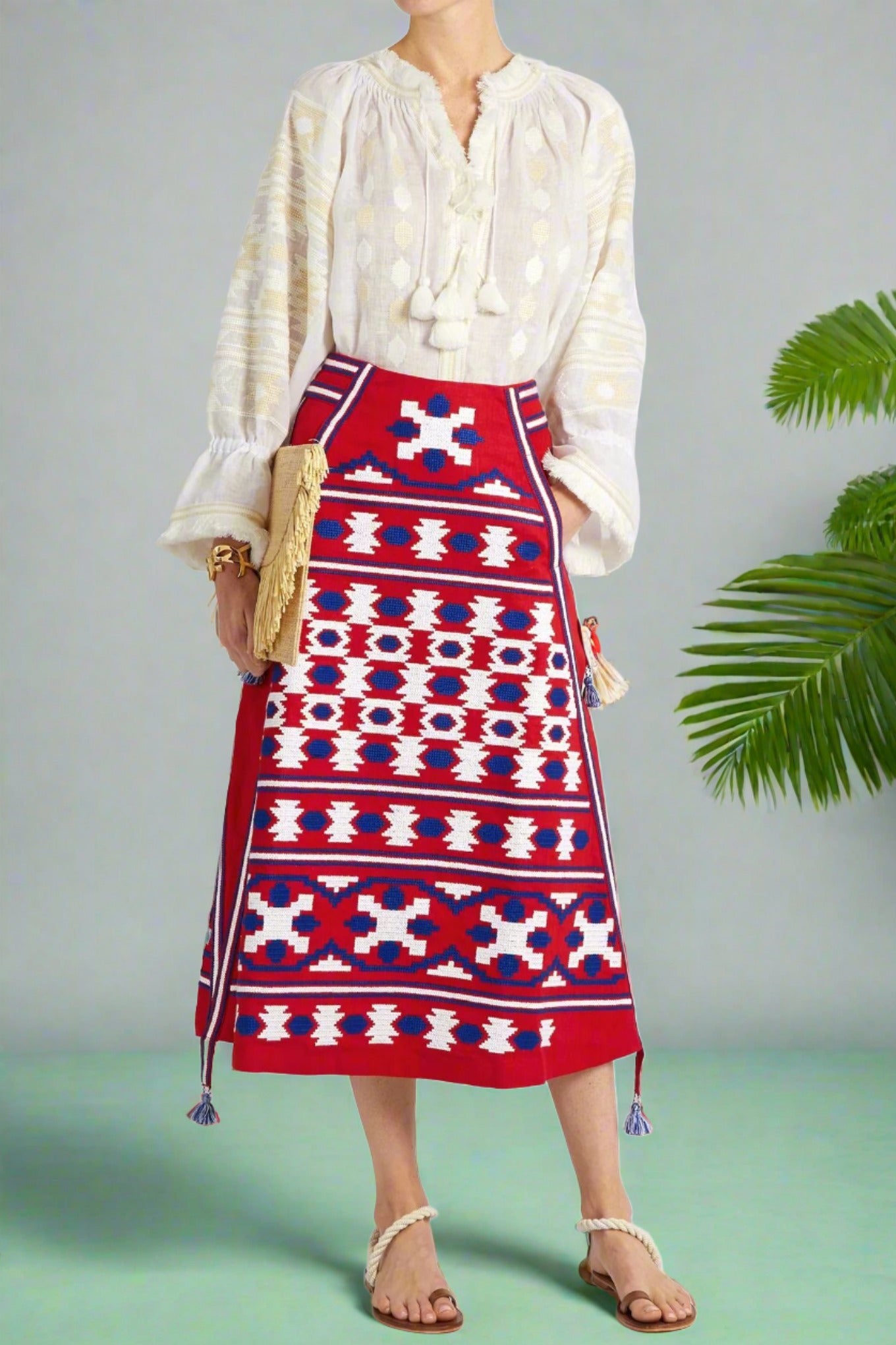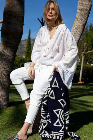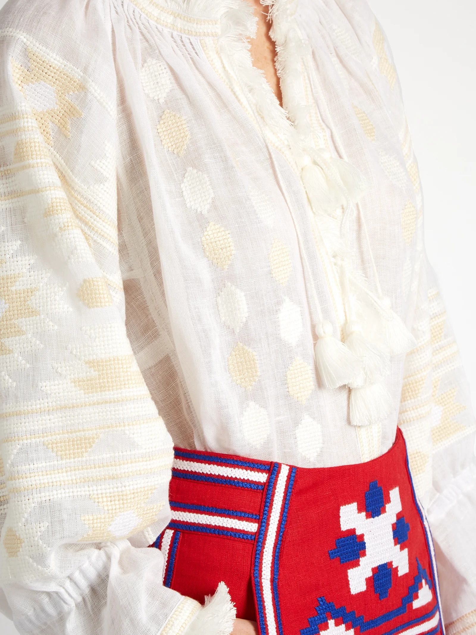 This white linen blouse boasts intricate embroideries and features tassels on its deep V-neck, making it a unique and elegant addition to your summer beach wardrobe. Customize your order by selecting from a wide range of colors and choosing your preferred length.