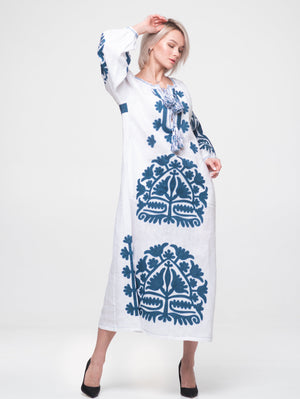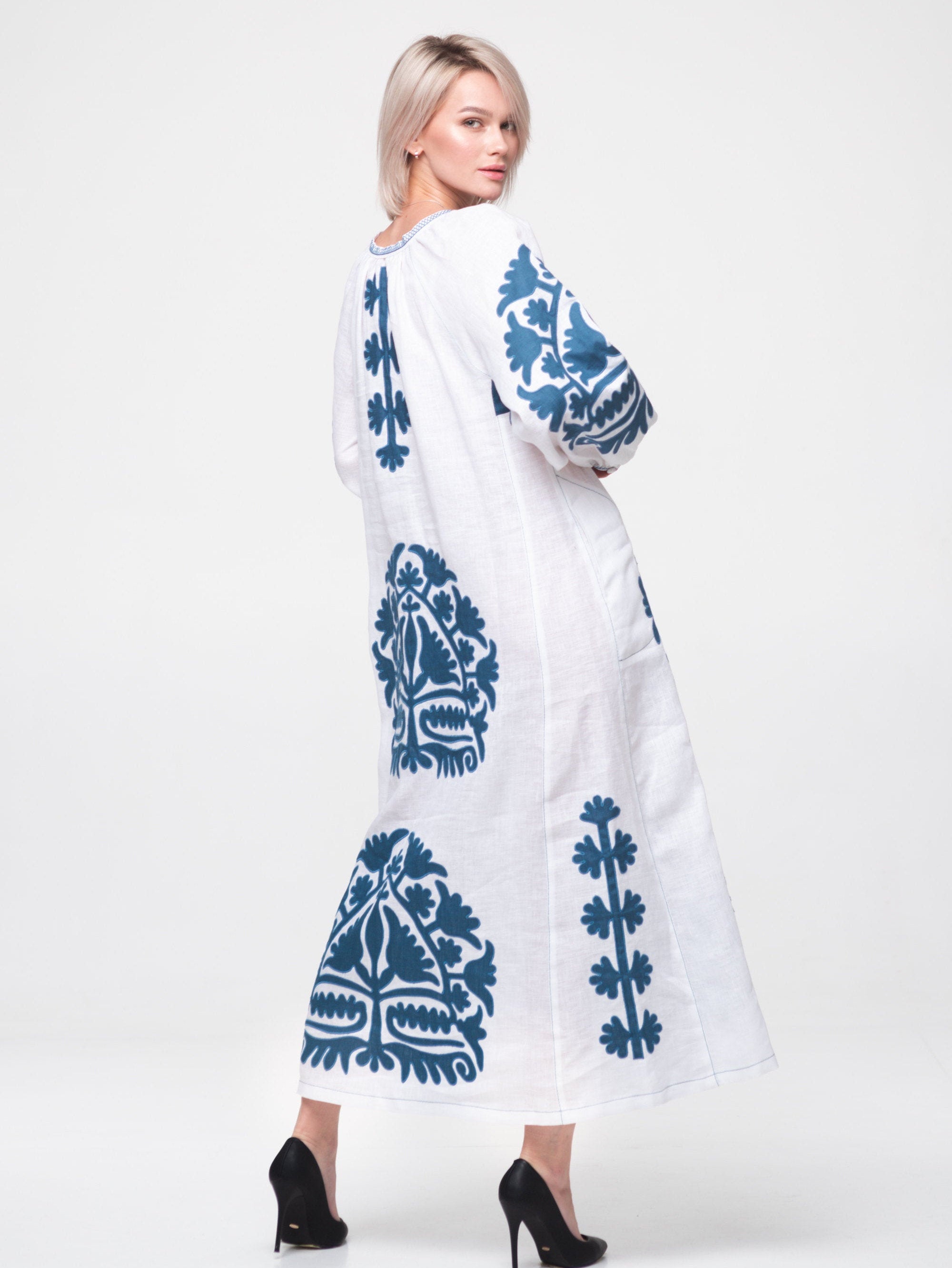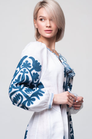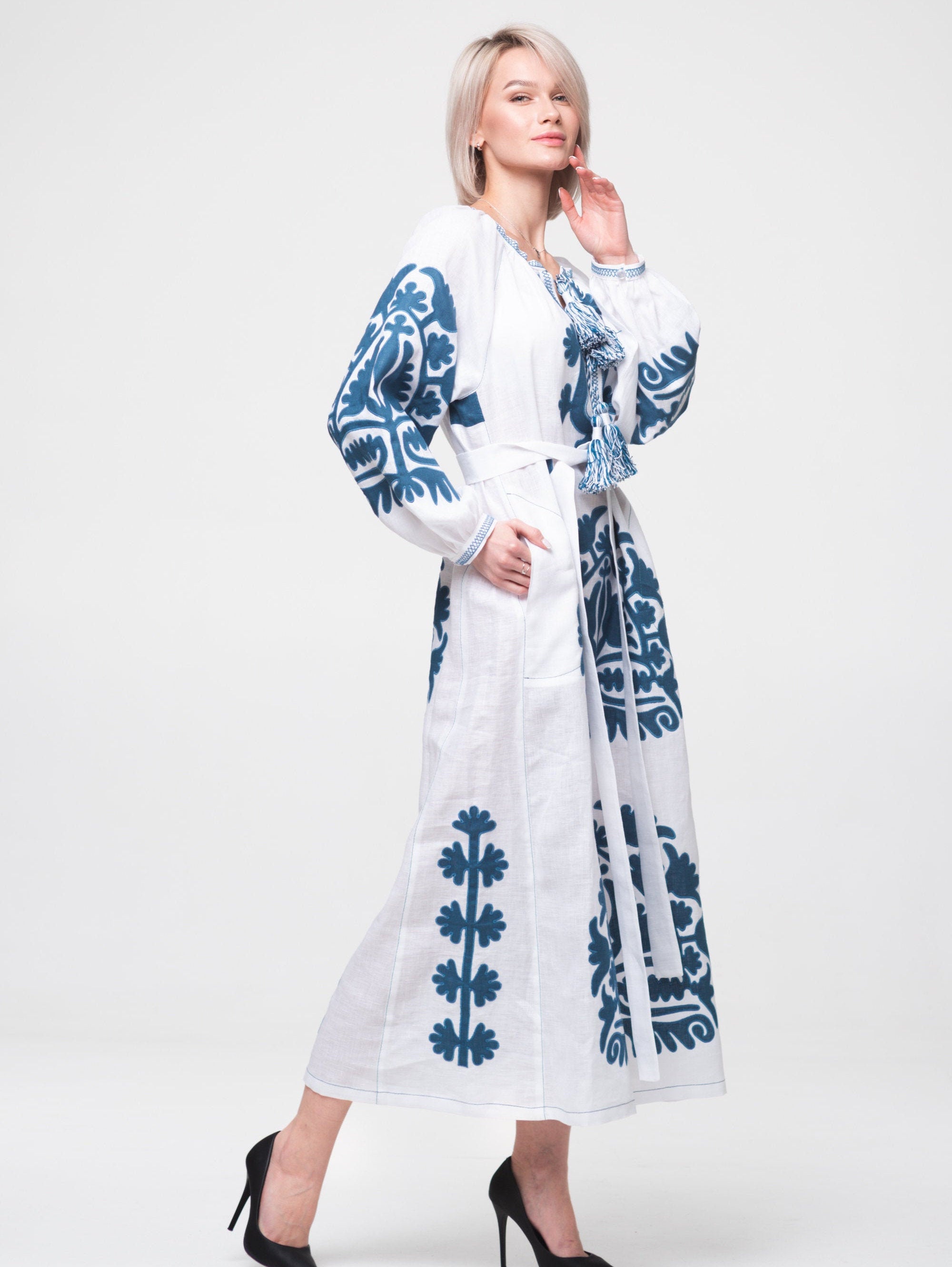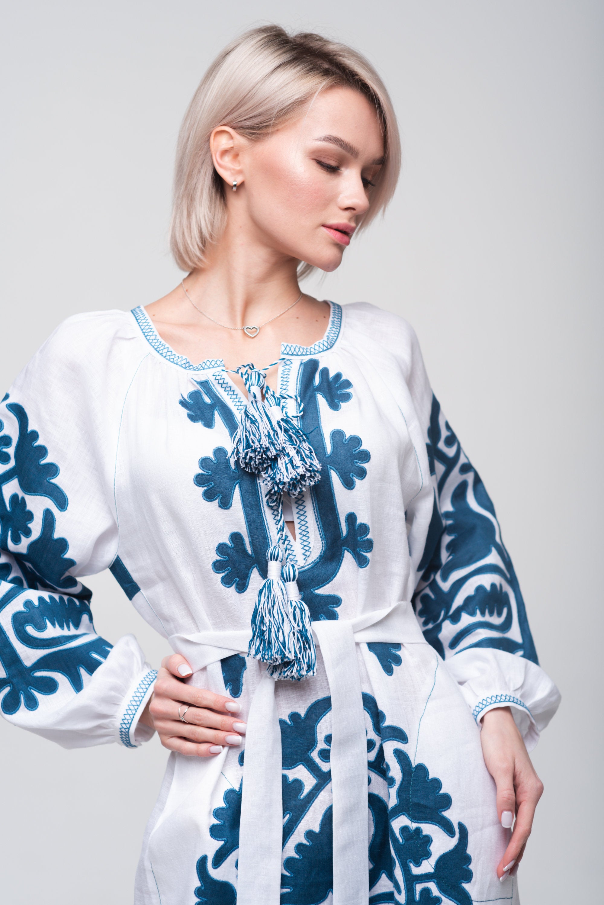 Discover the rich history and impeccable artistry of our Ukrainian linen gown. Handcrafted with care, this dress is available in various colors and lengths, perfect for any event. The design features bold hues, meticulous embellishments, and fashionable puffed sleeves adorned with pom-poms, imparting a sense of sophistication to the V-neck silhouette.